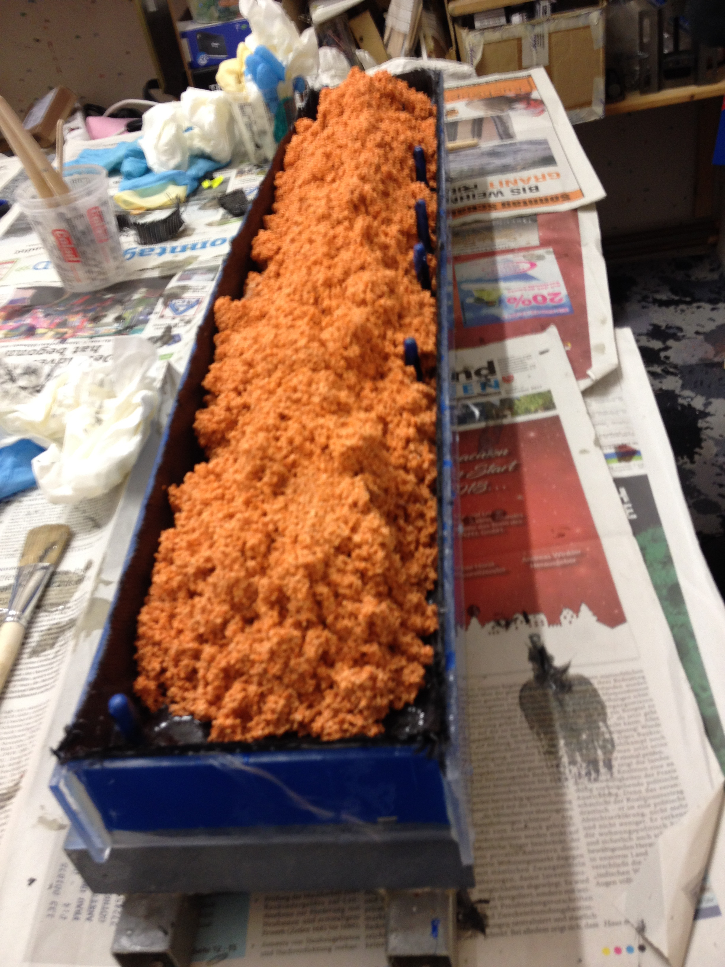 Wir haben heute auch endlich mal wieder eine Form gebaut, Aufbau aus Kohle und Poraver. Bis jetzt hat alles erstaunlich gut und problemlos geklappt, mal gucken, ob das bis zum Entformen so bleibt.
