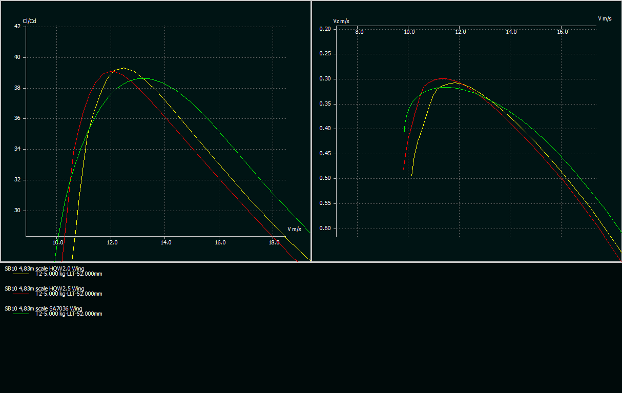 Der SA Strak zeigt gegenüber den HQWs eine etwas schlechtere Absolutleistung was bestes Gleiten und geringstes Sinken angeht, hat aber dafür die breitere Polare. Zumindest im XFLR5 sieht der SA Strak bisher am angenehmsten aus.