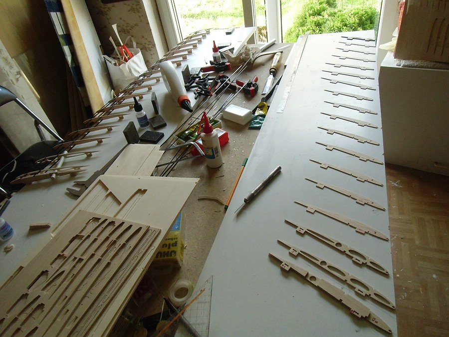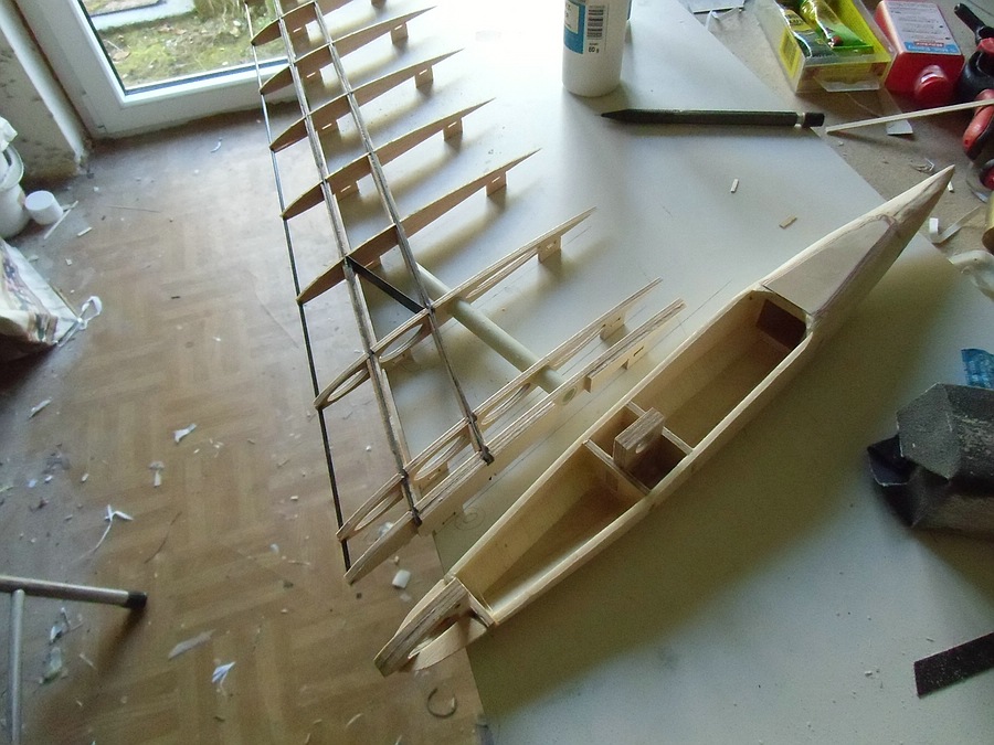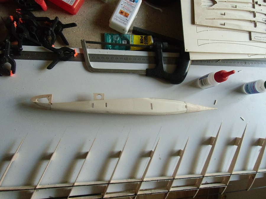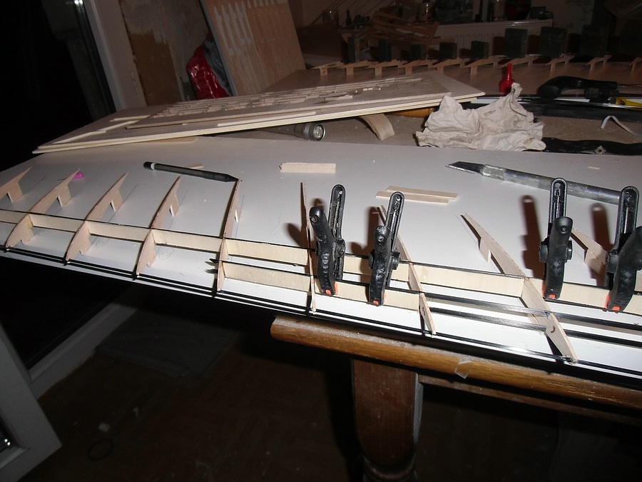 Gestern hab ich noch die erste Endleistenoberseite aufgeklebt und heute mach ich noch ein paar Rippenaufleimer drauf....die Du Dir ja gespart hast