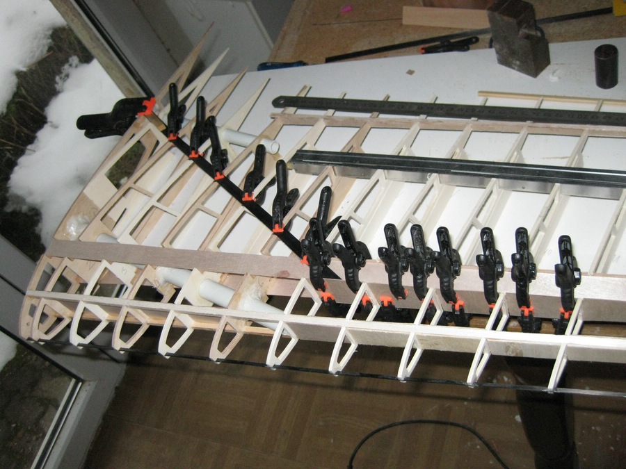 Alle Modelle entstehen aus gefrästen Pappel- und Birkensperrholzrippen und sind mit 0,6 mm Birkensperrholz beplankt (außer bei Brian, ich glaub der beplankt mit 0,4 mm Birke). Die Holme bestehen bei allen aus Kieferleisten, nur ich verwende laminierte Kohleholme. Die bisher fliegenden 3 Modelle haben schon bei relativ niedrigen Geschwindigkeiten Probleme mit Flügelflattern die ich von meiner ähnlich großen Ho IIIe nicht kenne, deshalb bau ich einige Modifikationen ein um das hoffentlich bei mir abzustellen...die Ur-Konstruktion ist nicht von mir.