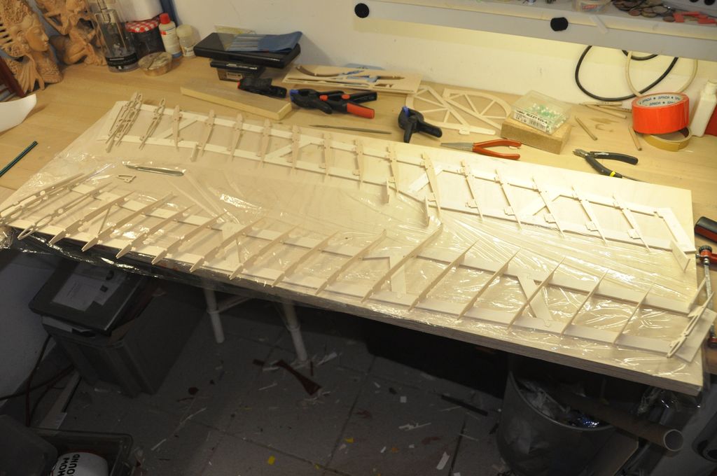 Die Flächen sind zu 90% fertiggestellt. Die zwei Rümpfe bereits fertig.