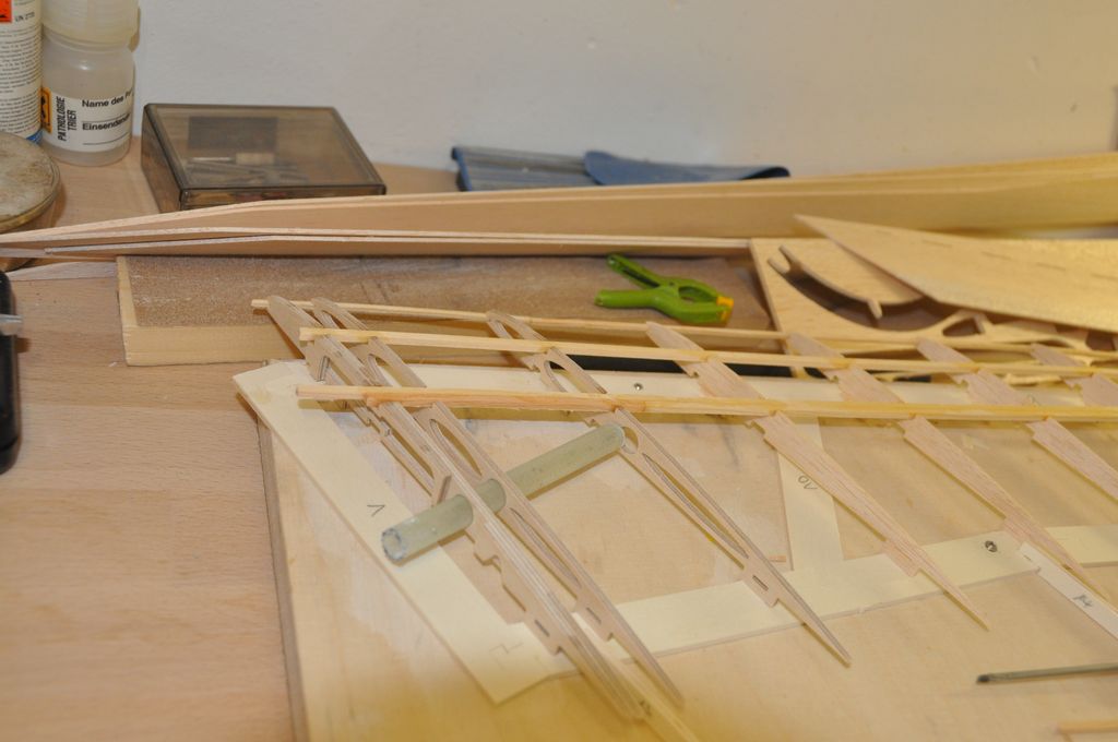 Dann Fläche aus der Helling nehmen und mit Leimzwingen beide Flächen an den Wurzelrippen aneinander klemmen. Dabei die Aussparungen des Steckungsrohrs der zweiten Fläche anpassen und wenns spaltfrei paßt das Rohr mit angeklemmter erster Fläche und mit eingestecktem Steckungsstab einkleben.