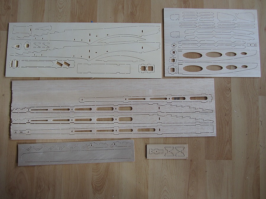 Ich habe damit begonnen, dass ich die Teile mit einem scharfen Cutter aus den Platten geschnitten und die Reste der Haltestege abgeschliffen habe. Anschließend habe ich die Aufdopplungen des Rumpfhecks und der Flächenbefestigungsplatten aufgeleimt.