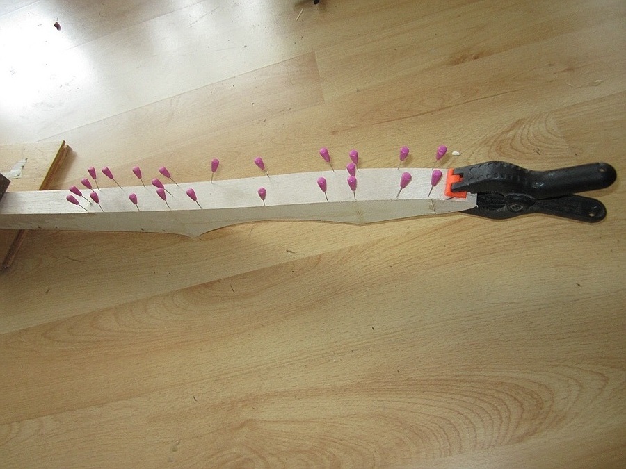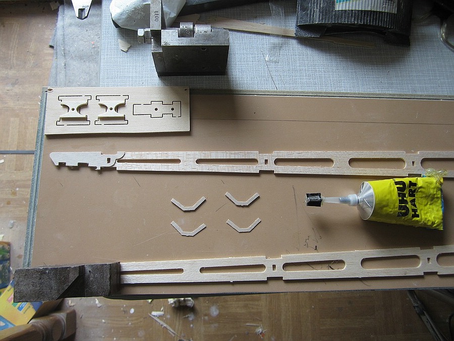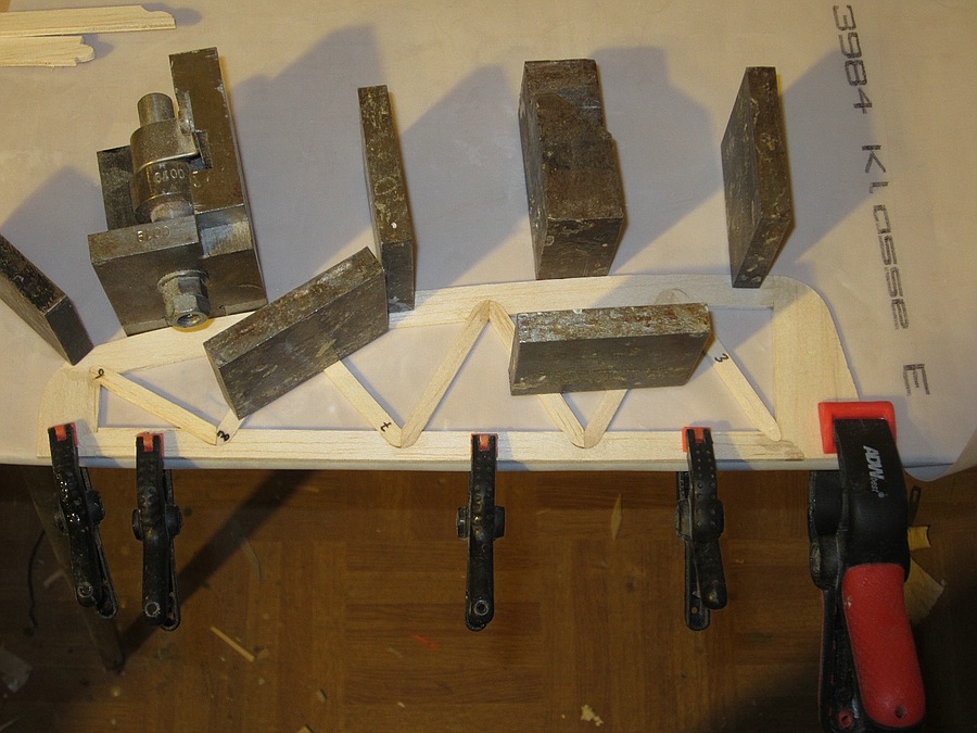 Die Ruderklappen werden in Stegbauweise auf einer Trennfolie auf absolut ebener Unterlage entsprechend einer Übersichtszeichnung aufgebaut, hier habe ich mit wenig dünnen CA geklebt