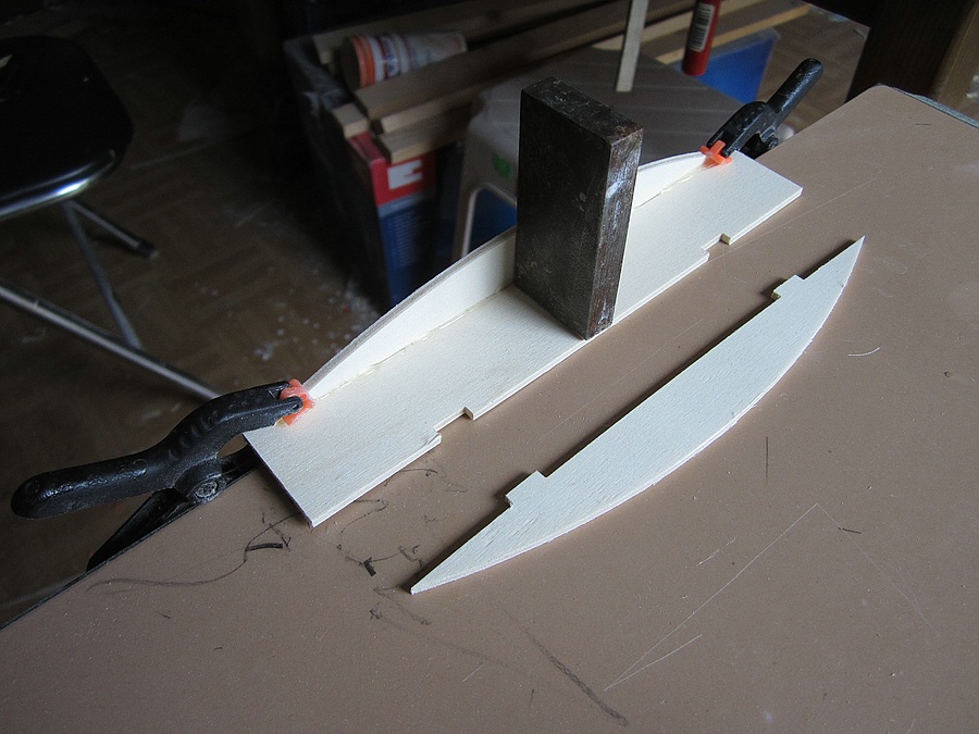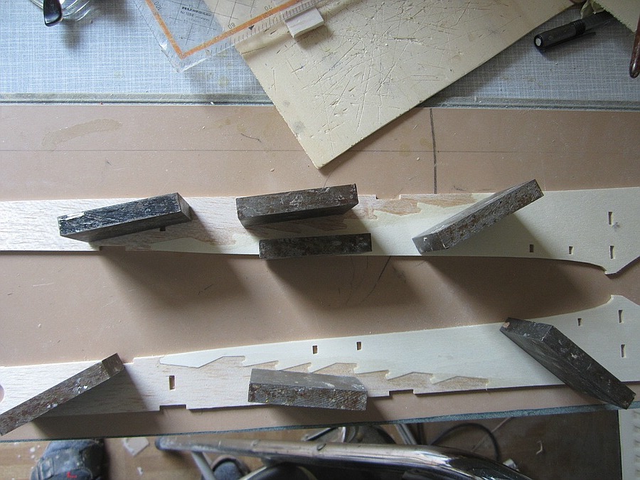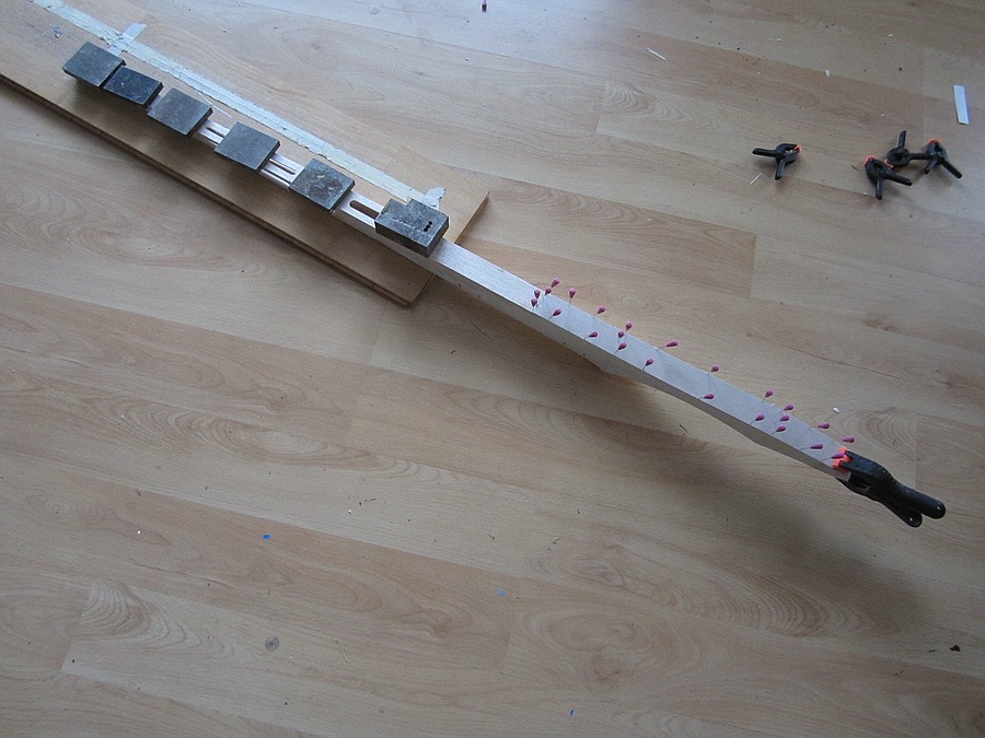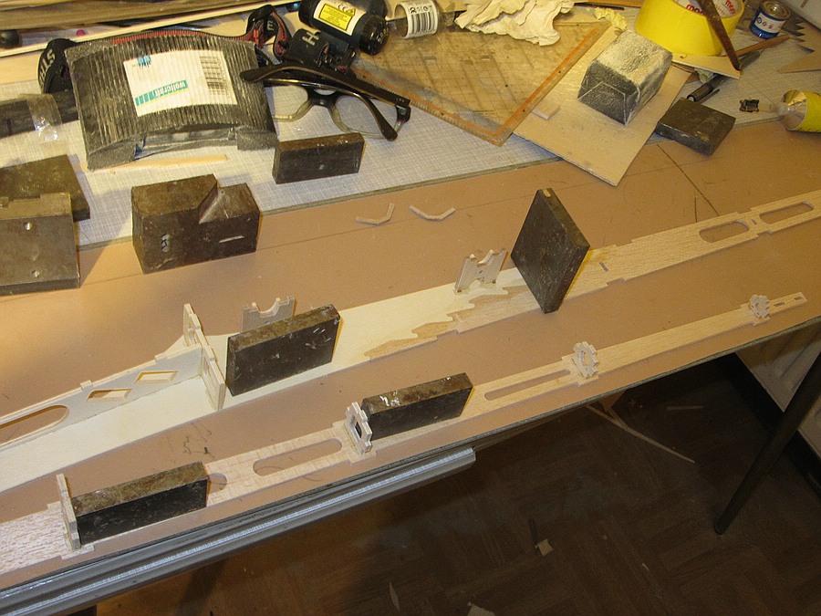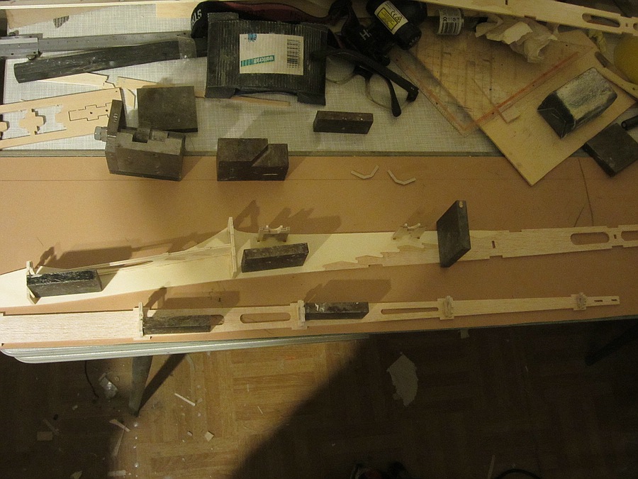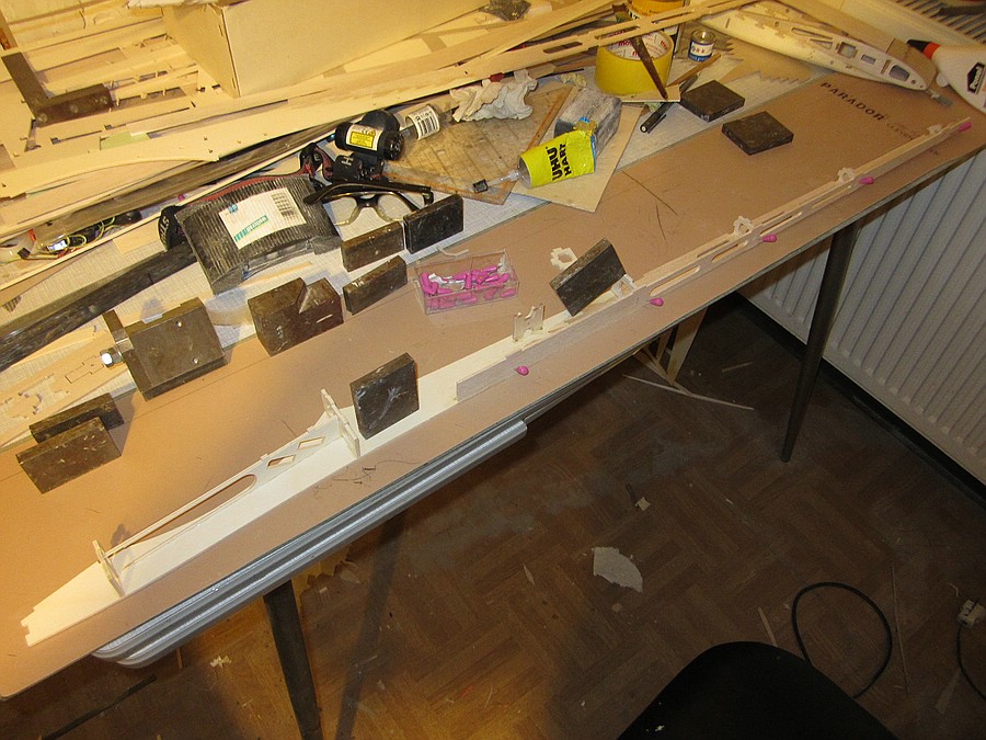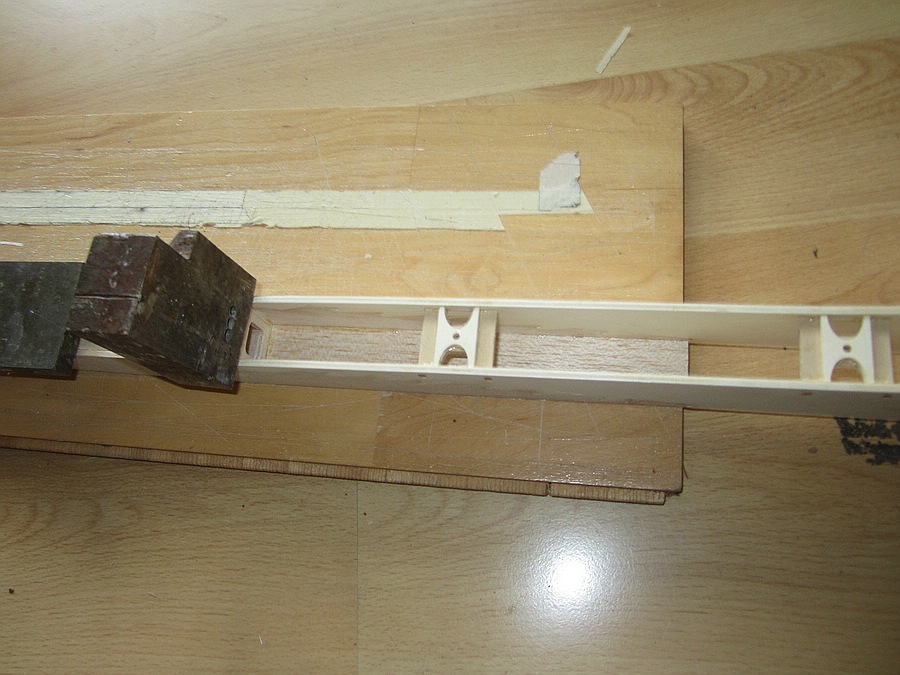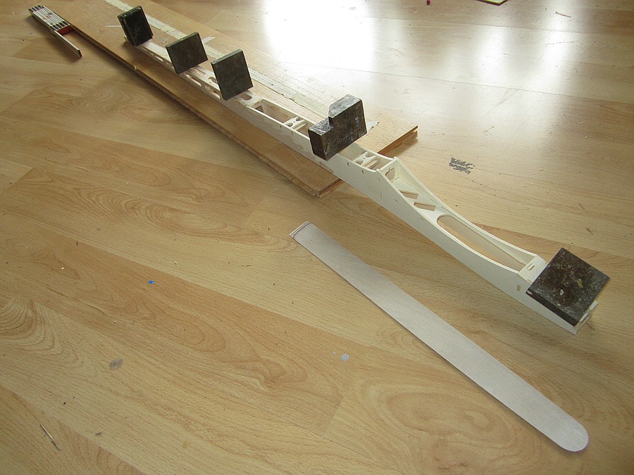 Zum aushärten des UHU-Hart habe ich den hinteren Teil des Rumpfes auf ein ebenes Brett gelegt und mit Gewichten beschwert damit kein Verzug enststeht. Da die Rumfnase nach unten abgebogen ist muss da Brett mindestens 15 mm dick sein um eine plane Auflage des Rumpfhecks zu ermöglichen.