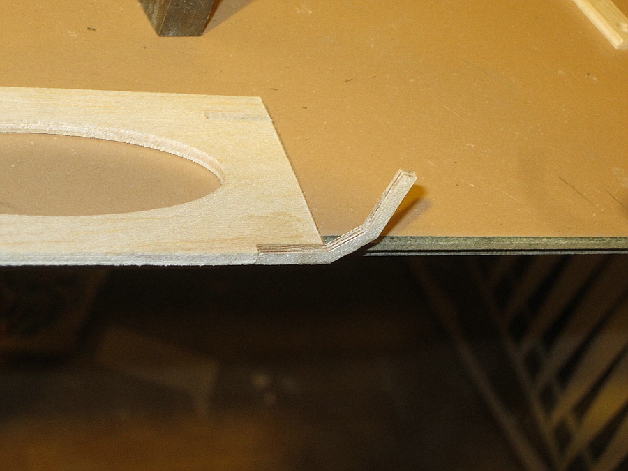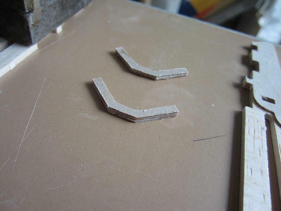 Die kleinen Winkel verbinden später die V-Leitwerkshälften. Es werden je 3 Frästeile paßgenau aufeinander geleimt, so dass 2 Verbindungswinkel aus je 9 Lagen Sperrholz entstehen.