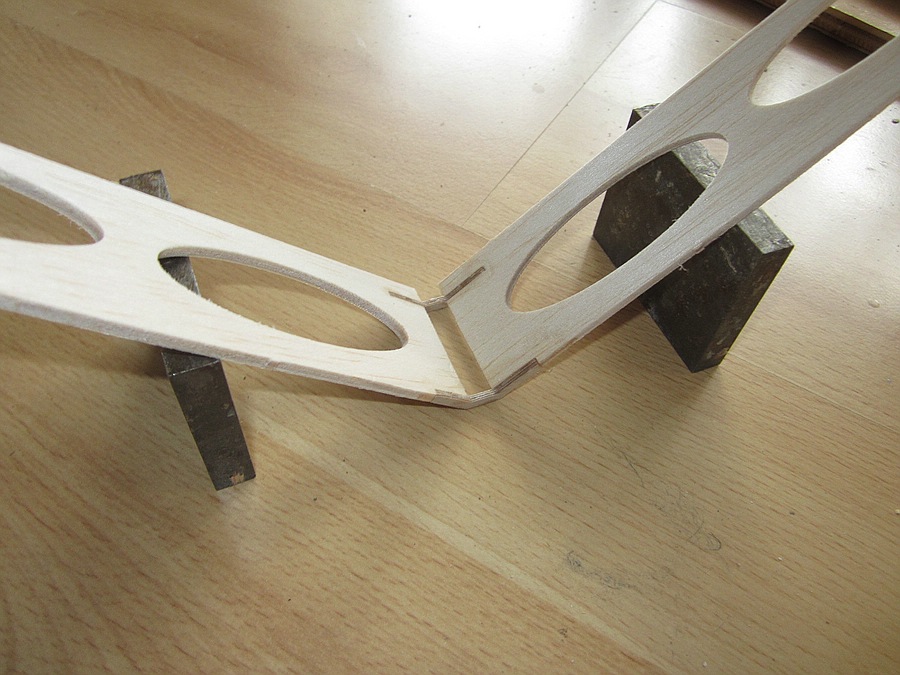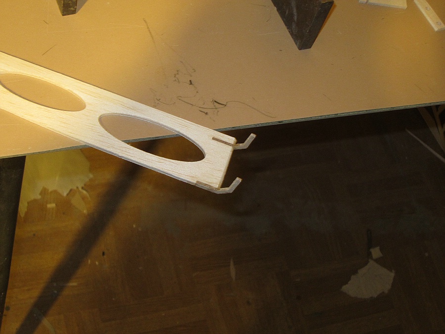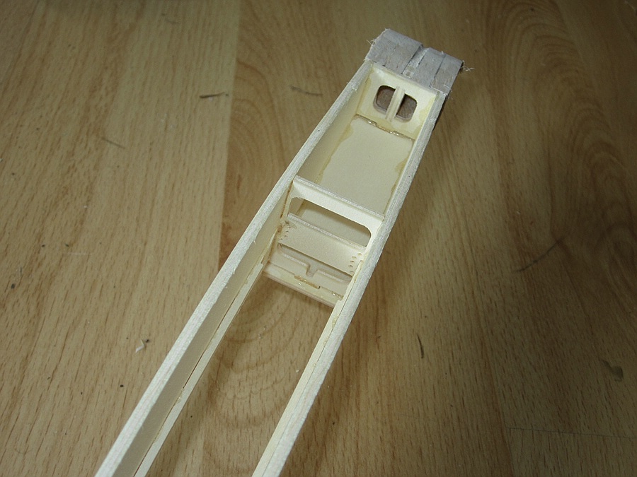 Die Spanten und Flächenbefestigungen aus Sperrholz des vorderen Rumpfbereichs werden auf der Innenseite der Rumpfseitenwand aufgebaut, die Balsaspanten des hinteren Rumfbereichs auf dem Rumpfboden.