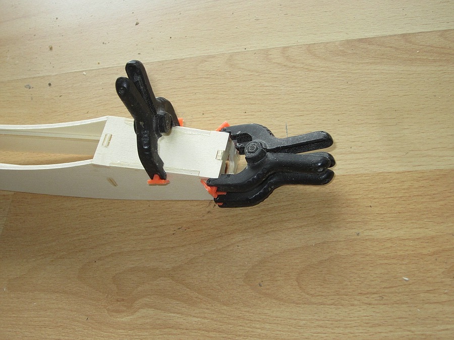 Anschließend wird der Rumpfboden auf die Seitenwand geleimt und fixiert. bis hierher habe ich alle Verklebungen mit UHU-Hart ausgeführt.