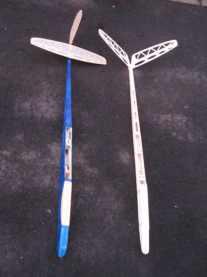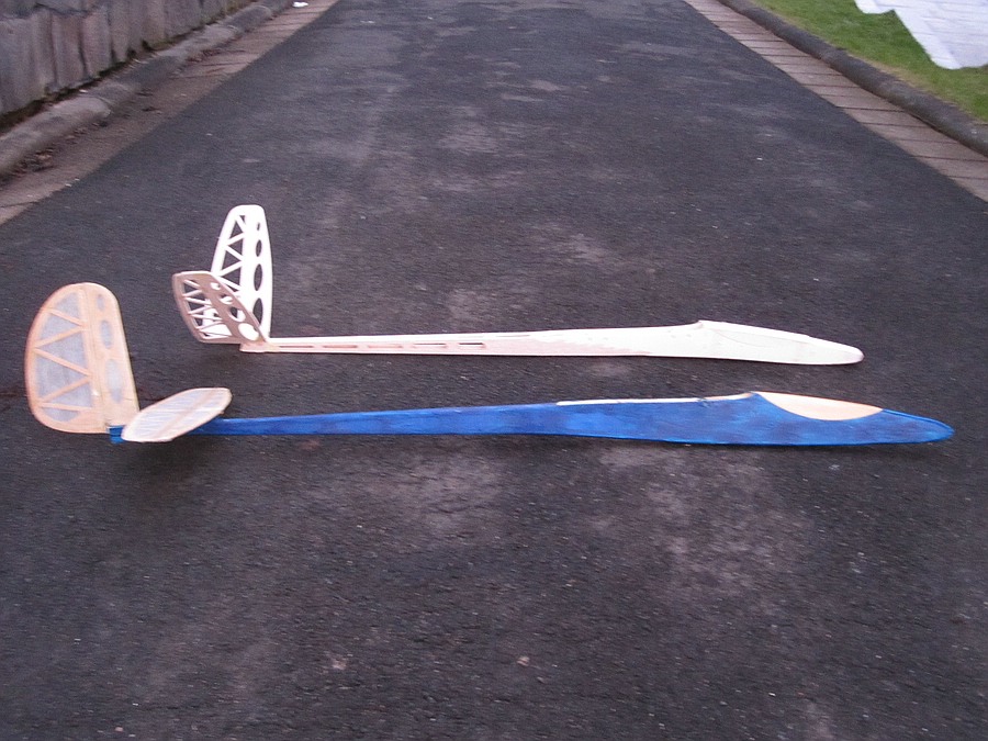 Wie bei der K-Variante besteht der vordere Rumpfteil aus Pappelsperrholz, der hintere aus etwas dünnerem Balsaholz, die so zusammen geleimt werden müssen, dass spiegelbildliche Teile mit glatter Außenseite entstehen. Also bitte auch besonders darauf achten dass der Dickenversatz der Rumpfteile auf der selben Seite ist wie die Aufdopplung des Rumpfhecks. Auf dem Bild sieht man den Dickenversatz ein bisschen.