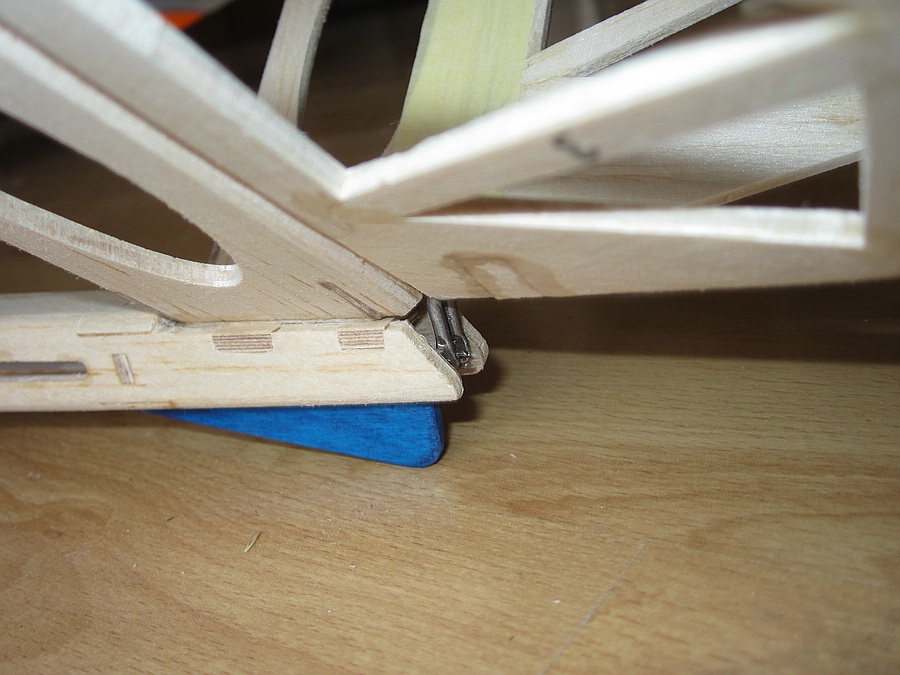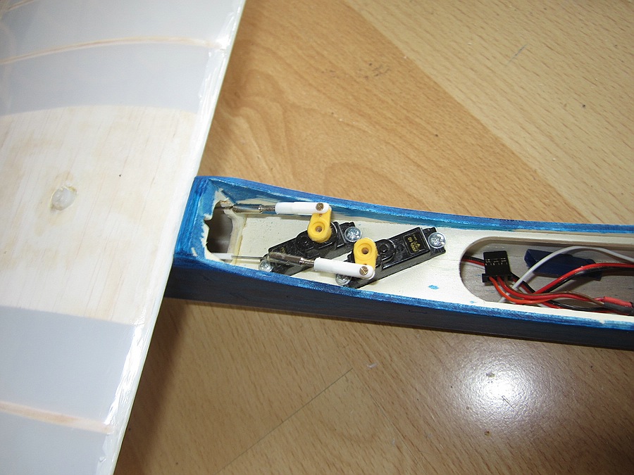 Im Moment sind nur die Löcher für die Bowdenzug-Innenrohrchen für die Anlenkung mit 0,8er Stahldraht in den Spanten. Ich hatte keine Röhrchen mehr und muss die jetzt von außen montieren, sollte aber durch die Löcher in den Rumpfwänden keine Probleme bereiten. Anlenken will ich das so ähnlich wie bei meiner Ostflieger-Clara auf dem Bild, das hat immer zuverlässig und leicht demontierbar funktioniert.
