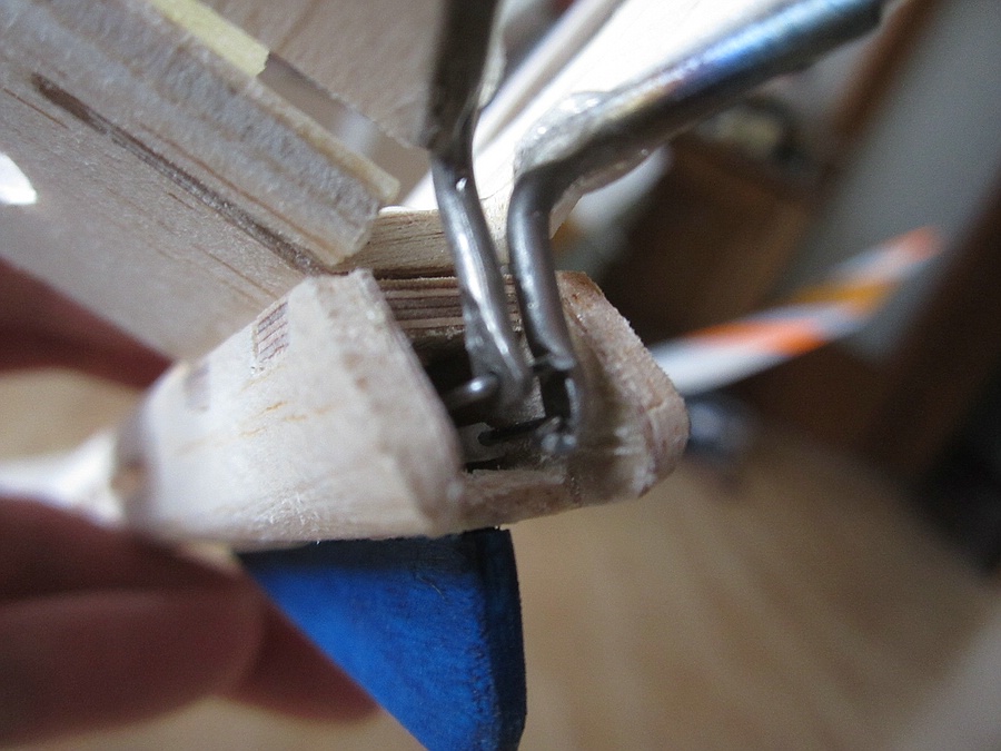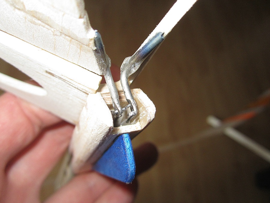 Ruderhörner sind 2,5 mm Titandraht, unten mit einem Schraubstock breit gedrückt und ein 1 mm Loch für abgekröpften 0,8er Stahldraht rein gebohrt. In der Serie soll da ein GFK-Teil mit gleicher Funktion rein, dass ich noch konstruieren muss.