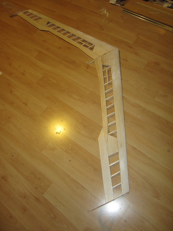 Als Holme kommen die dickeren Easton Fatboy rein die zusätzlich mit abgestuften cfk Rechteckprofielen 4x1 / 3x1mm verstärkt und 8er Rohren verlängert werden. Das meiste Material die Vollrippen bestehen aus 2mm Balsa, die Halberippen dann noch 1,5mm. Ein kleiner Teil 0 / 1 und 2 ist 2mm Sperrholz. Die Winglets 1mm und Beplankungen der Steckungsrippen und Ruder 0,6mm Sperrholz.