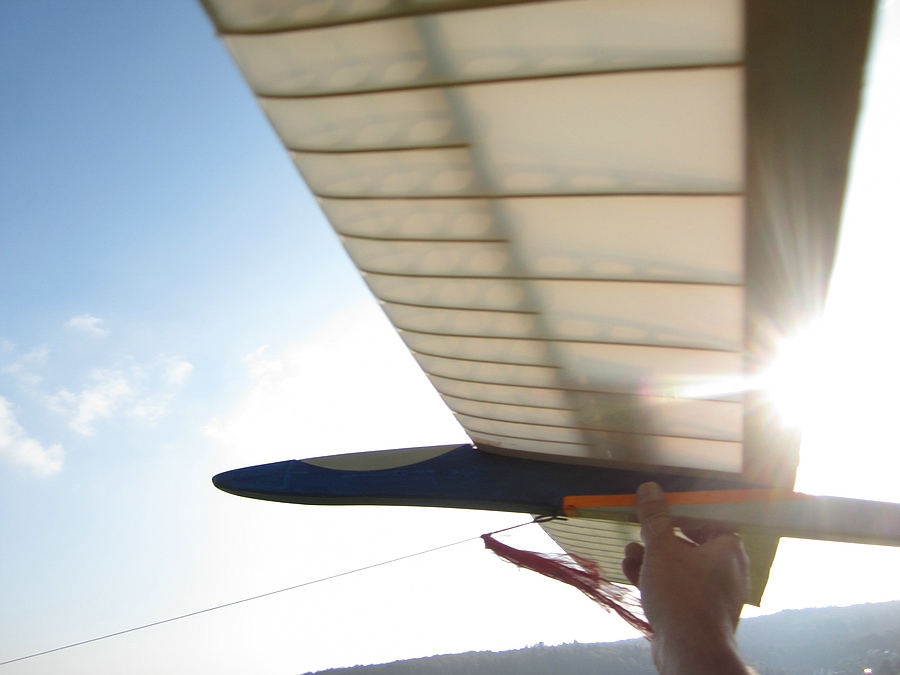 Zunächst habe ich bei den ersten Starts das Trimmblei nach und nach entfernt, jetzt ist genau Null Gramm drin und der Schwerpunkt entspricht jetzt in etwa meinen Vorstellungen.