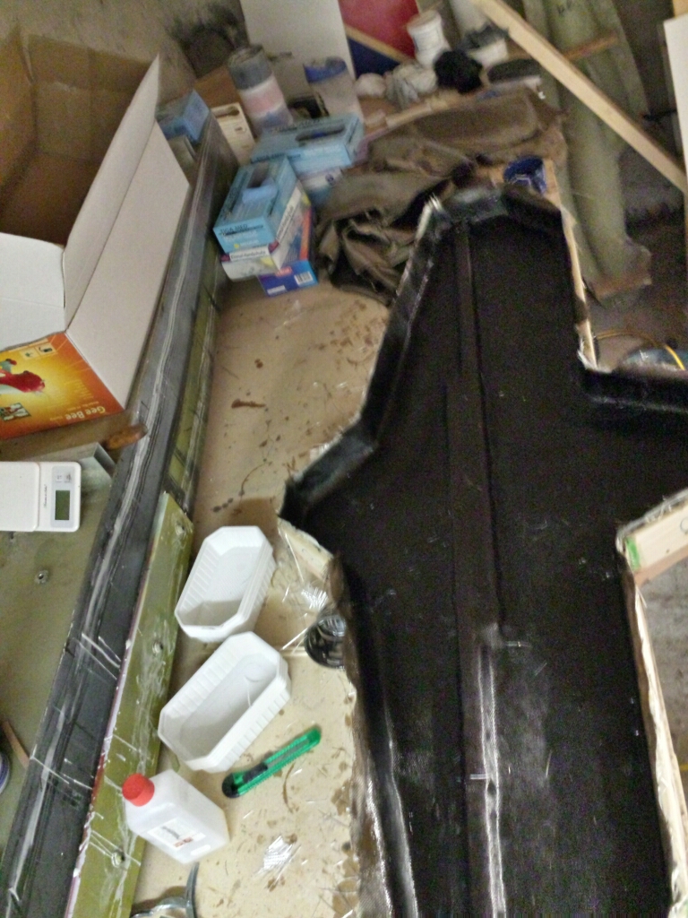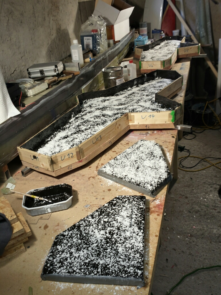 und hier nachdem einige Lagen aus 300er Glasgewebe, eine Balsaltlage zur schönen Optik sowie Versteifungen draufgekommen sind: