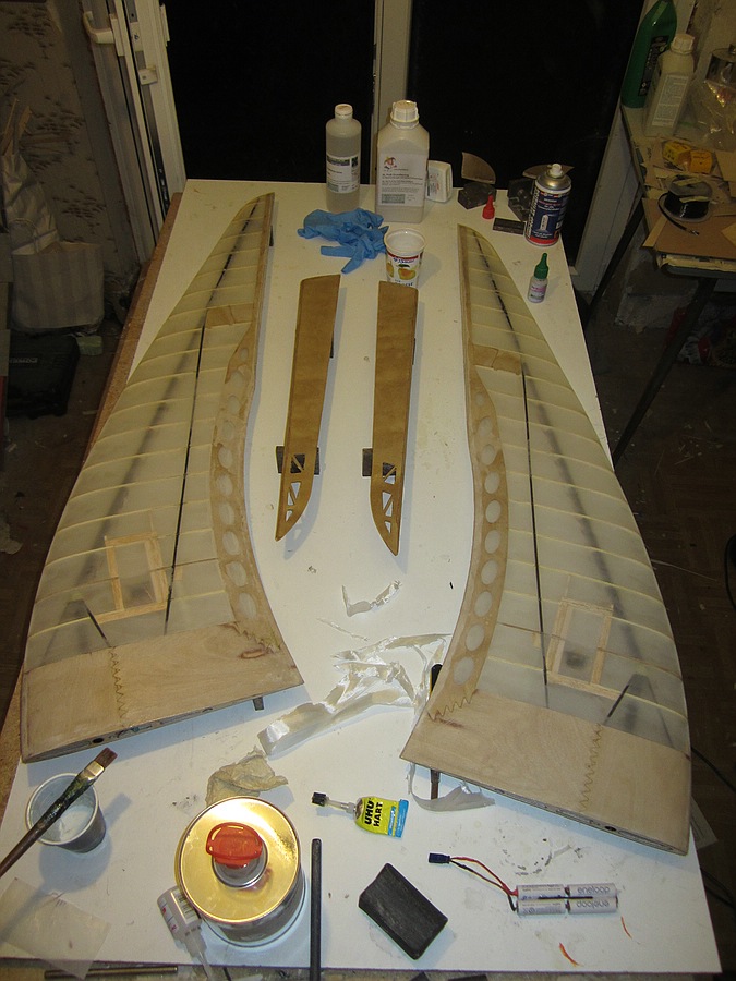 Hallo Leute, die Fertigstellung des Rohbaus hat noch ein Wochenende länger gedauert, aber nachdem klar war dass ich den Flieger dieses Wochenende nicht in die Luft bekomme habe ich mir gedacht, ich mach die restlichen Arbeiten lieber gescheit als schnell. Wann der neue Mimares fliegt weiß ich noch nicht, im Moment sind die Ruder ausgetrennt und es sind vor dem Bespannen noch ein paar kleine Restarbeiten zu machen die aufhalten, aber ich bleib dran.UweH hat geschrieben:Kommendes Wochenende sollte der Rohbau eigentlich fertig sein und es macht tatsächlich viel Spaß den Flieger zu bauen....naja, es ist halt auch so einiges an Verkastung dabei![]()