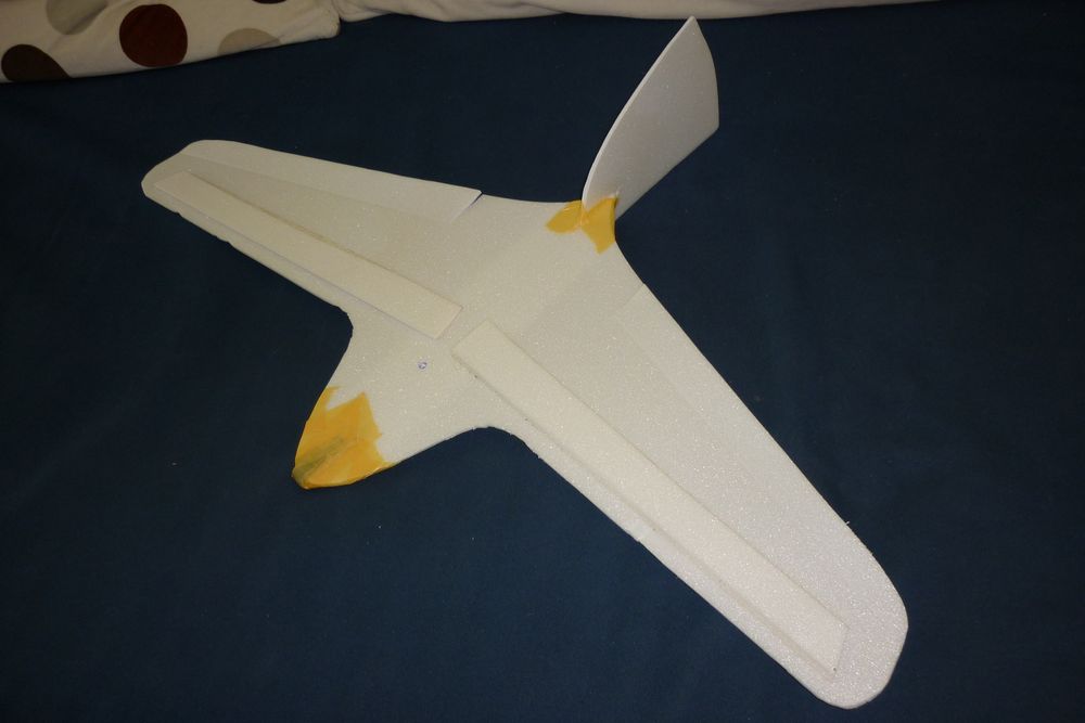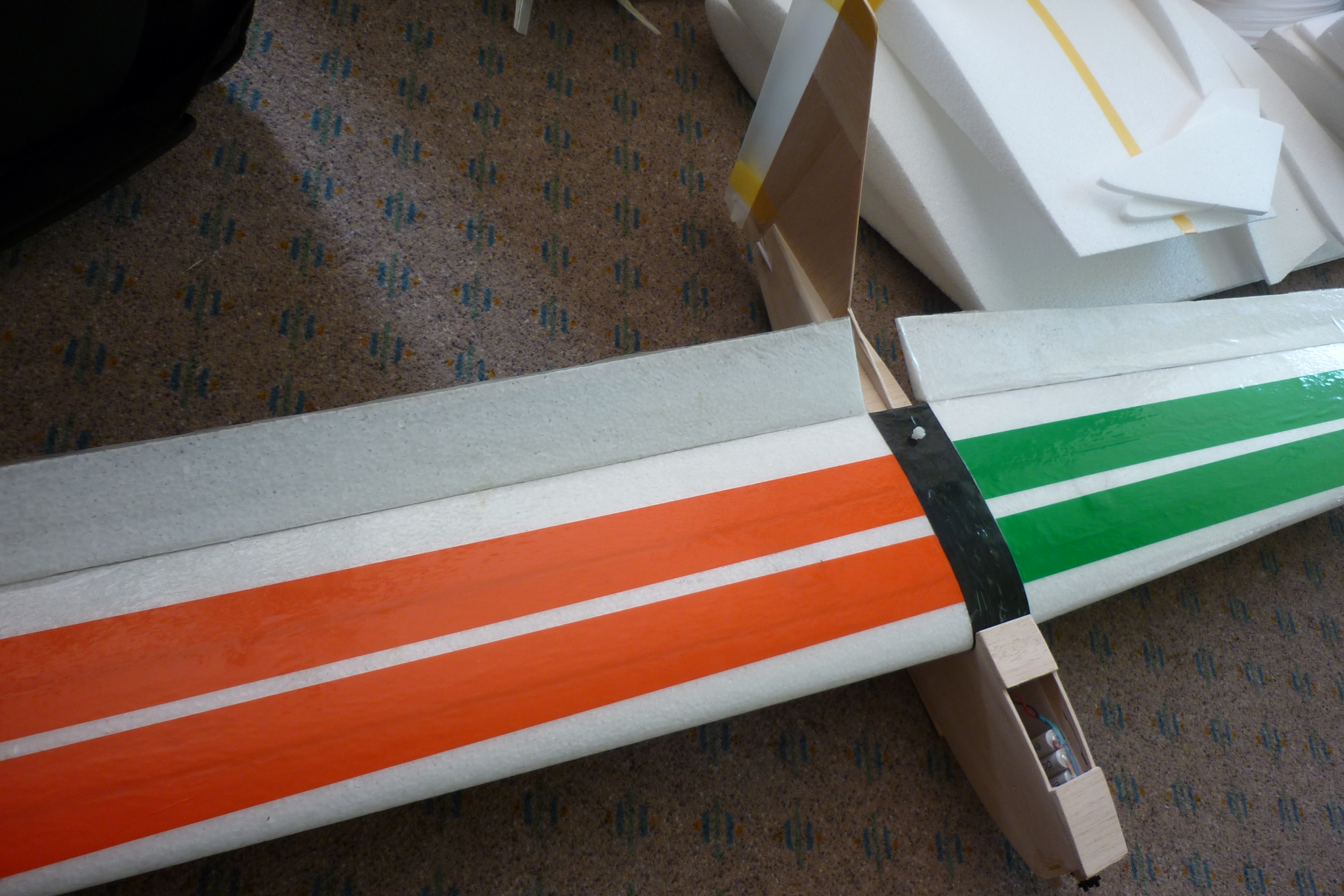 hab als Randleiste noch nen Streifen 30 er EPP in schwarz aufgepäppt (sieht man schlecht auf dem Bild) und zur Ruderverstärkung nen 3 mm Kohlestab eingeklebt...