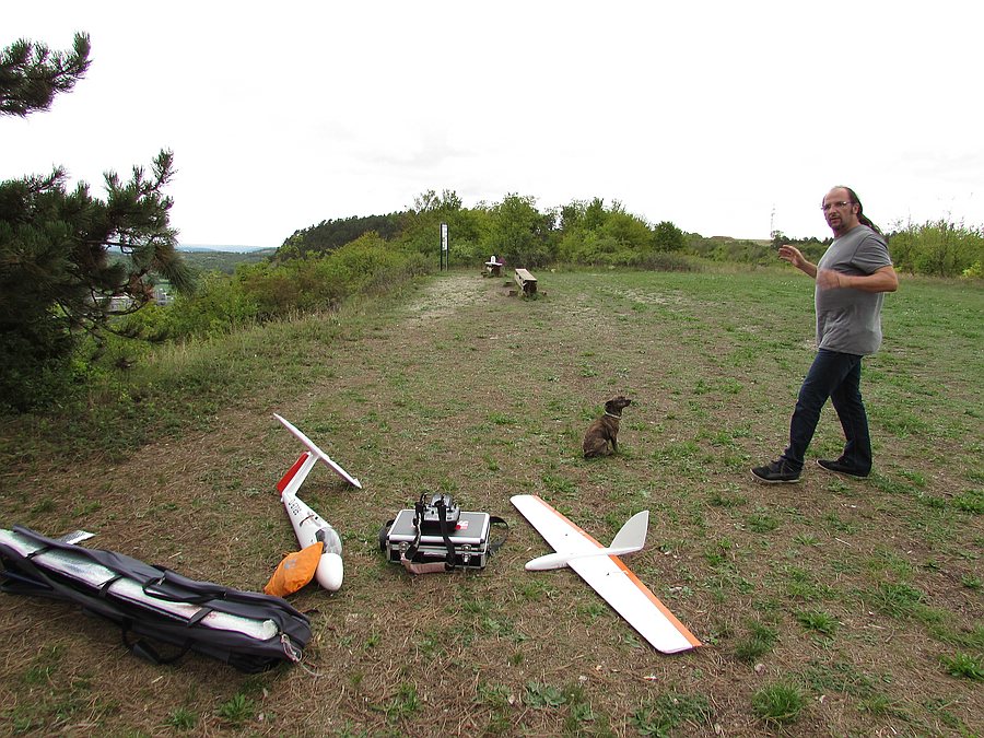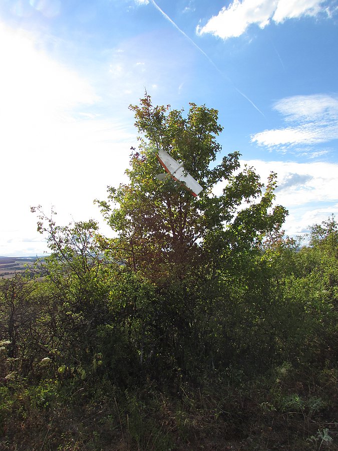 Heute zum Feierabend am Hang um 19:00 Uhr noch über 30° heiß, aber erfreuliche 2-3 Bft von halbrechts, so dass sich die Valenta B4 und der Energic wieder mal gut halten konnten. Eine größere Picknick- Truppe mit freilaufenden Hunden und Kindern in der Mini-Landezone verhinderte nach einer halben Stunde das fliegen von härterem Gerät und es wurde auf fliegende Einkaufsutensilien gewechselt: Stofftasche mit Körbchen unten dran und Verpackungsschaum
