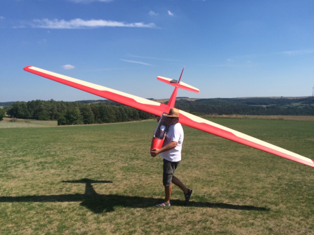 Ich bezeichne das als " Alltags - F3J ", weil es ein thermik - orientiertes Modell mit etwa F3J Abmaßen ist. Im Gegensatz zum Wettbewerbs - Modell, die ja in kompletter Vollschalenbauweise gefertigt sind, und bei gleicher Größe nur etwa die Hälfte wiegen, ist mein Eigenbau zwar mit einem CFK/ Kevlar/ Glas - Rumpf ausgestattet, Fläche und Höhenleitwerk allerdings in Styro/Furnier - Bauweise gefertigt. Er ist dadurch um einiges robuster, als die Wettbewerbsmaschinen,eben alltagstauglicher ... vor allem beim Bodenhandling; aber das wird natürlich mit dem höheren Gewicht erkauft.