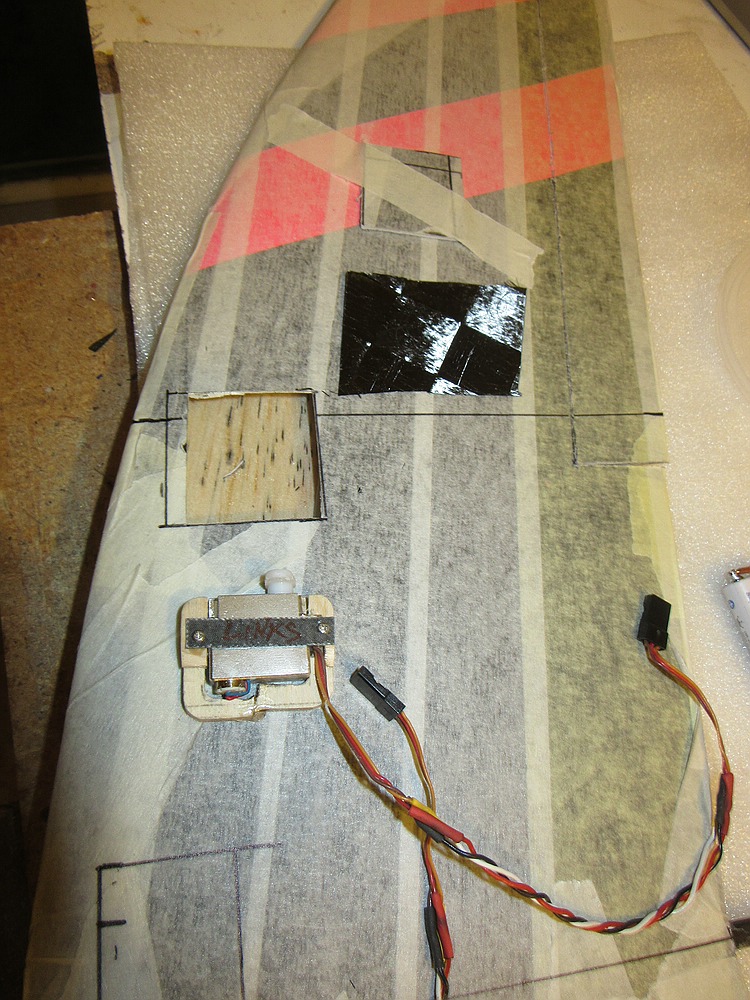 Die Servos habe ich auf der Seite die beim einkleben mit Harz in Berührung kommt mit Grundierwachs behandelt und die Rahmen anschließend zusammen mit einer Lage Kohlegewebe aus Reststücken eingeklebt: