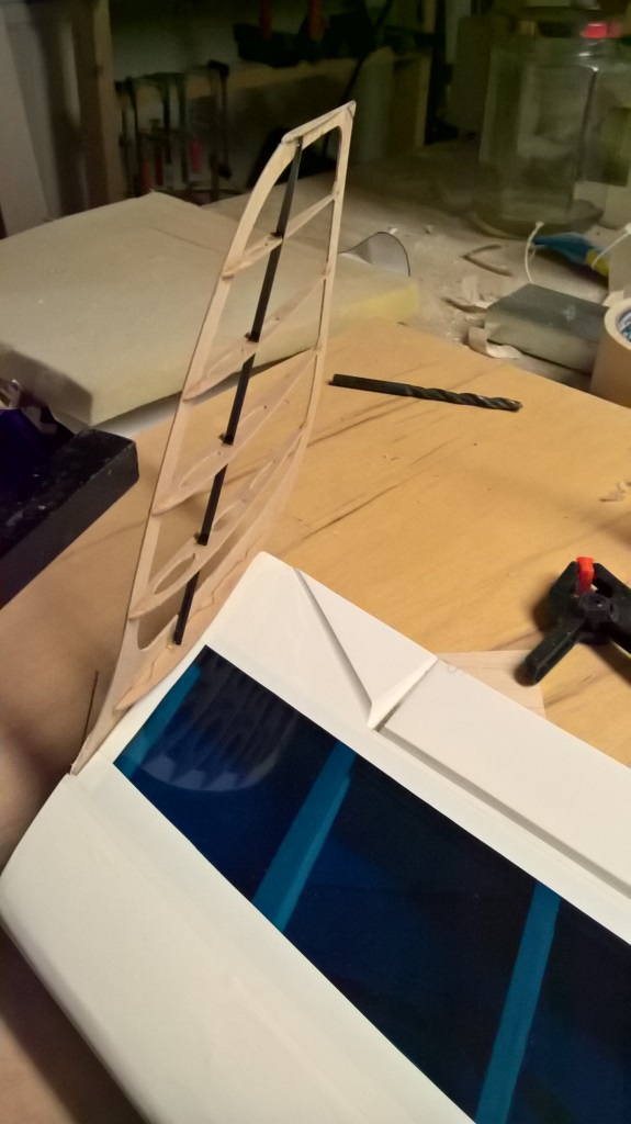 Ich hab Löcher in die Rippen gemacht, das ist mir im Moment lieber als dünneres Sperrholz zu verwenden. Im Urlaub ist mir mein ARES bei einem schlechten Handlandeversuch nach hinten runter gefallen, da hat es im Wingletgebälk geknackt und die Folie hat ein paar Falten geworfen, ich denke das 1 mm Sperrholz ist schon nicht sooo falsch bemessen.