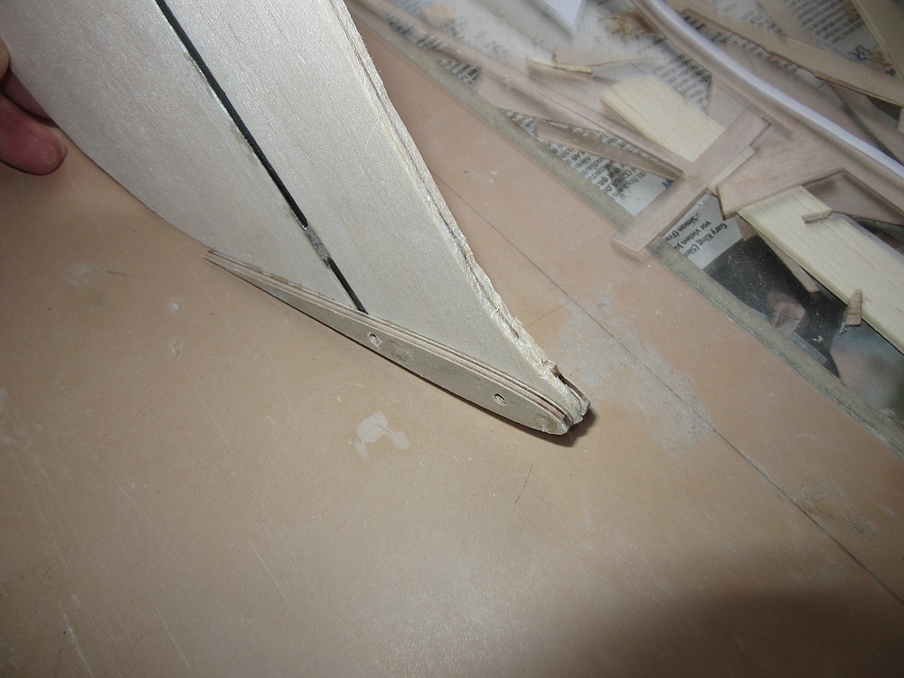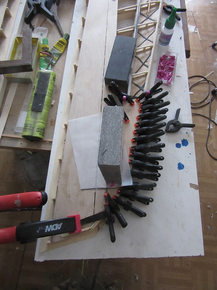Inzwischen ist auch die Außenleiste der Nasenleistenkonstruktion als zweite Lage 3 mm Pappelsperrholz mit dickem Seku angeleimt und verschliffen.
