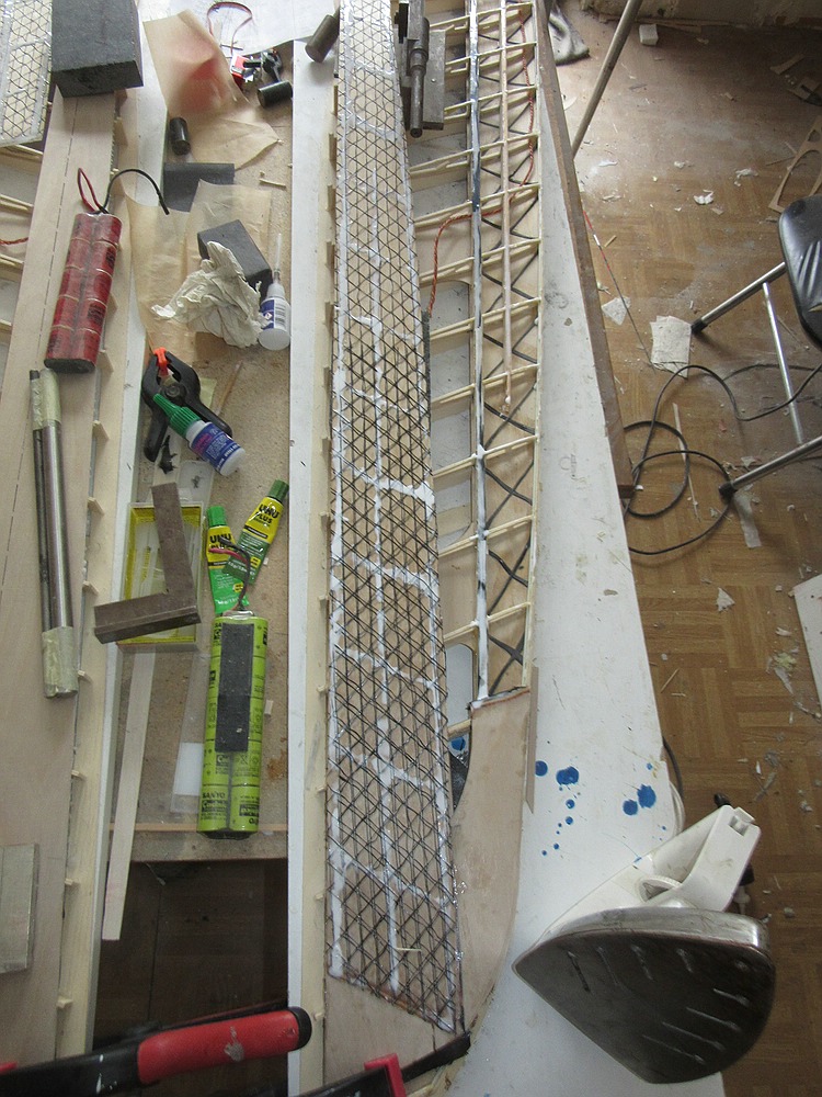 Das hat sich nicht gut bewährt weil sich das Sperrholz auch durch Harz leicht wellt und kein guter Verbund zwischen Gittergewebe und Beplankungssperrholz entsteht, die Beplankung ist um die Rundungen auch schlecht aufzupressen, die Leistenmethode funktioniert da nicht wirklich.