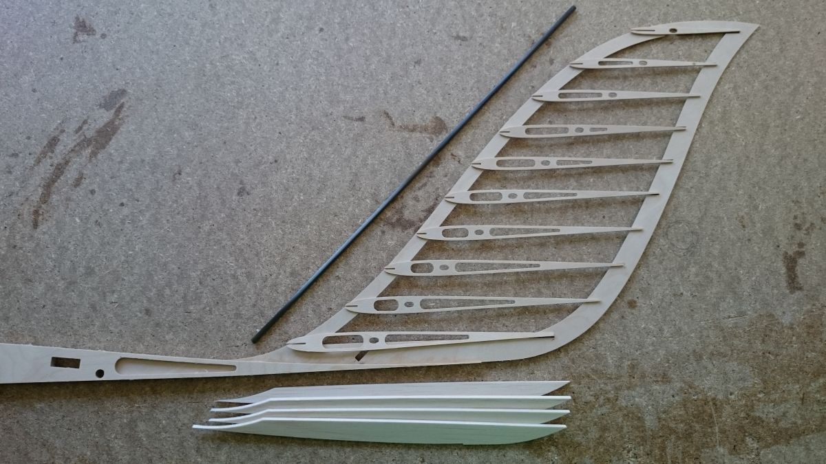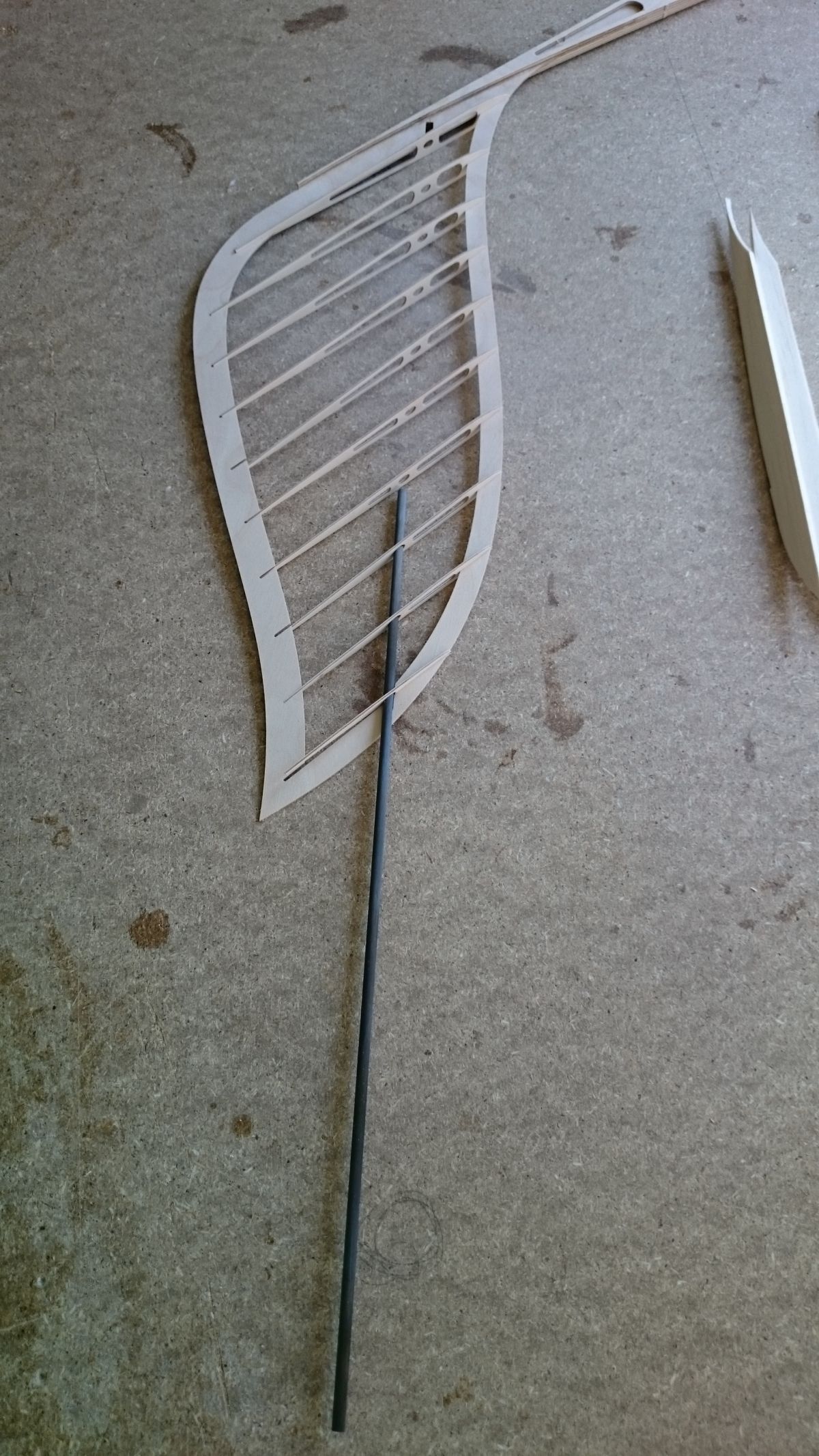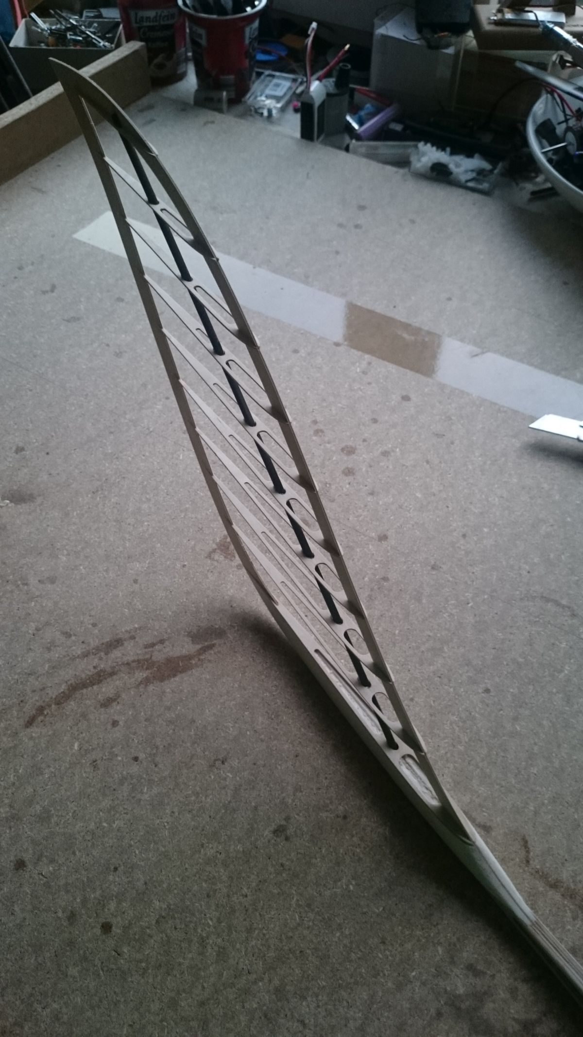Erst mal die Rippen sortieren, immer schön von groß nach klein und dann erst die Vollrippen von aussen nach innen einfädeln. Ist wesentlich einfacher als im Nachgang die Nasen/Endleiste in die Rippen zu bugsieren.