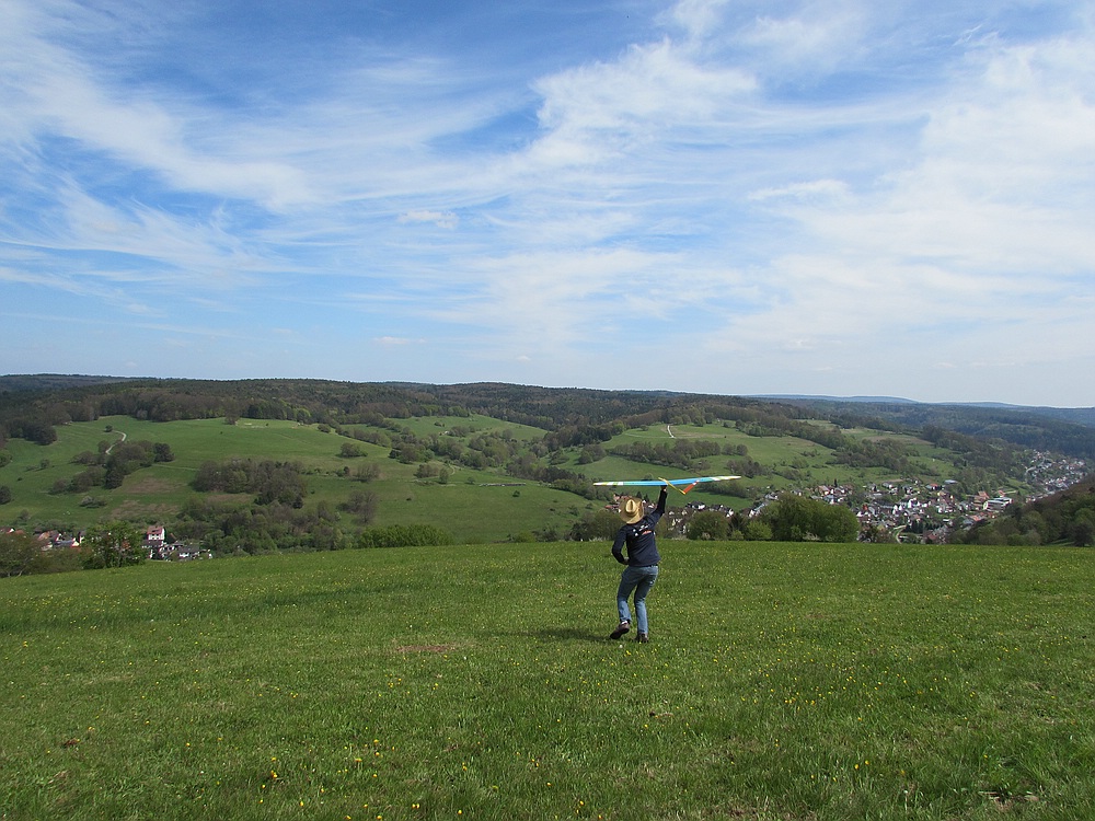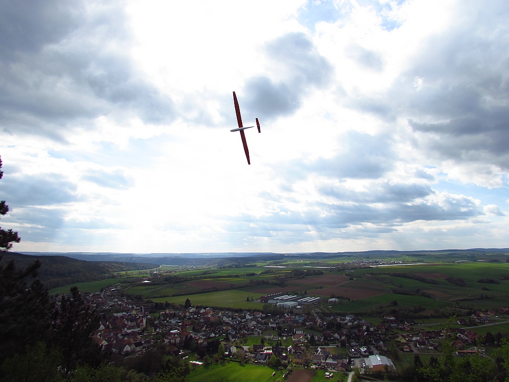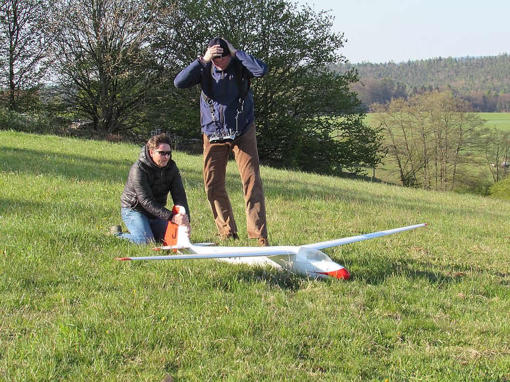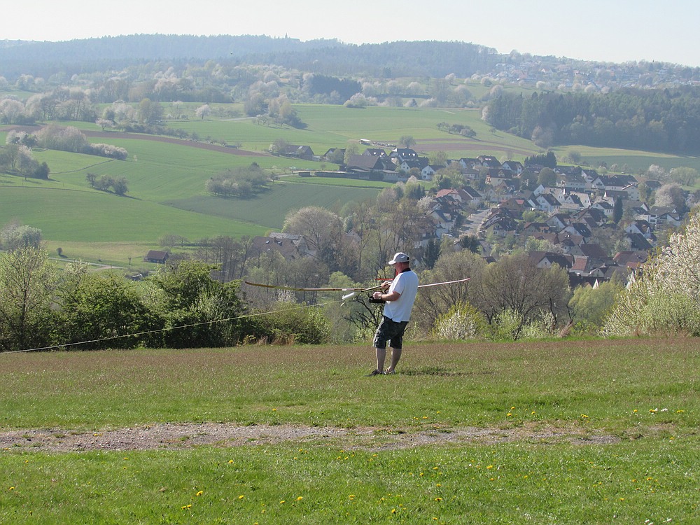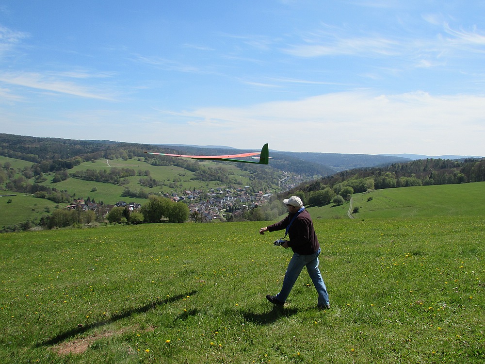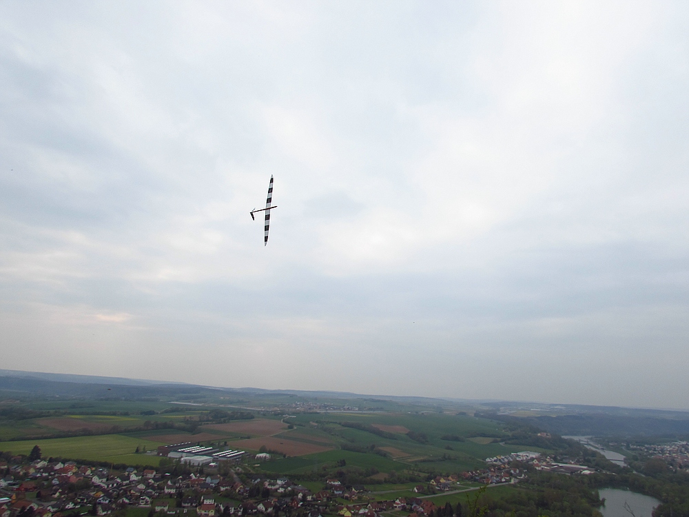 Heute hatte ich einen Tag Urlaub und hab den Nachmittag bei schönem Wetter und angenehmen Frühsommertemperaturen am Hang verbracht. Obwohl Windfinder für heute 1 Windstärke weniger voraus gesagt hatte waren die Bedingungen erheblich besser als beim Besuch von Gert und Sepp mit ihren Frauen Gestern, als wir vor allem die schöne Aussicht vom Felsen genossen haben, incl. Ausflug ins Unterholz zur Modellbergung wegen Absaufer nach kurzem Flug aus der Flitsche von Sepps Insect. Zum Glück hat das kleine Kerbtier nur einen Kratzer in der Nasenleiste abbekommen.
