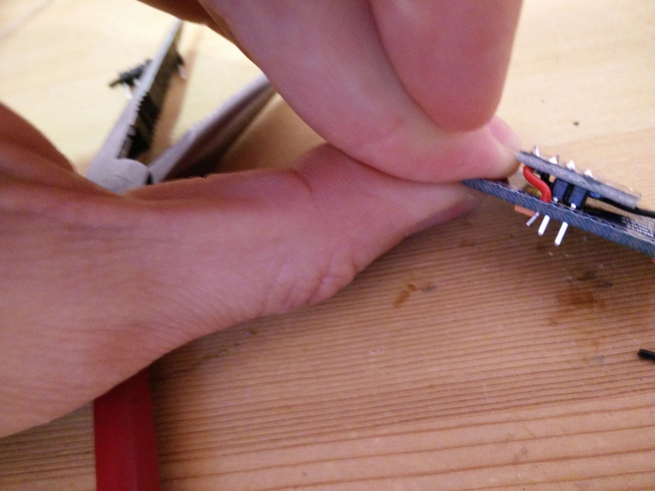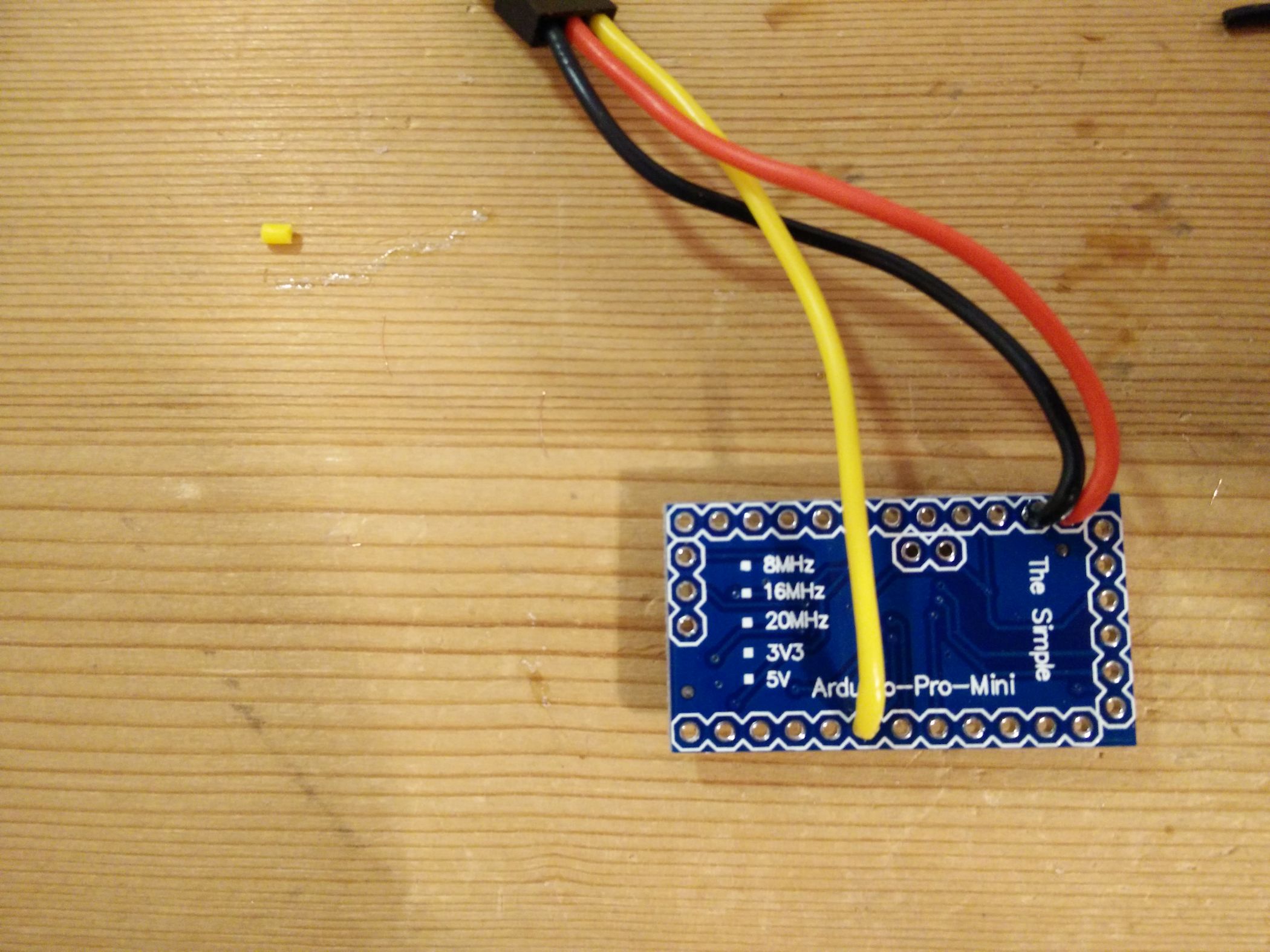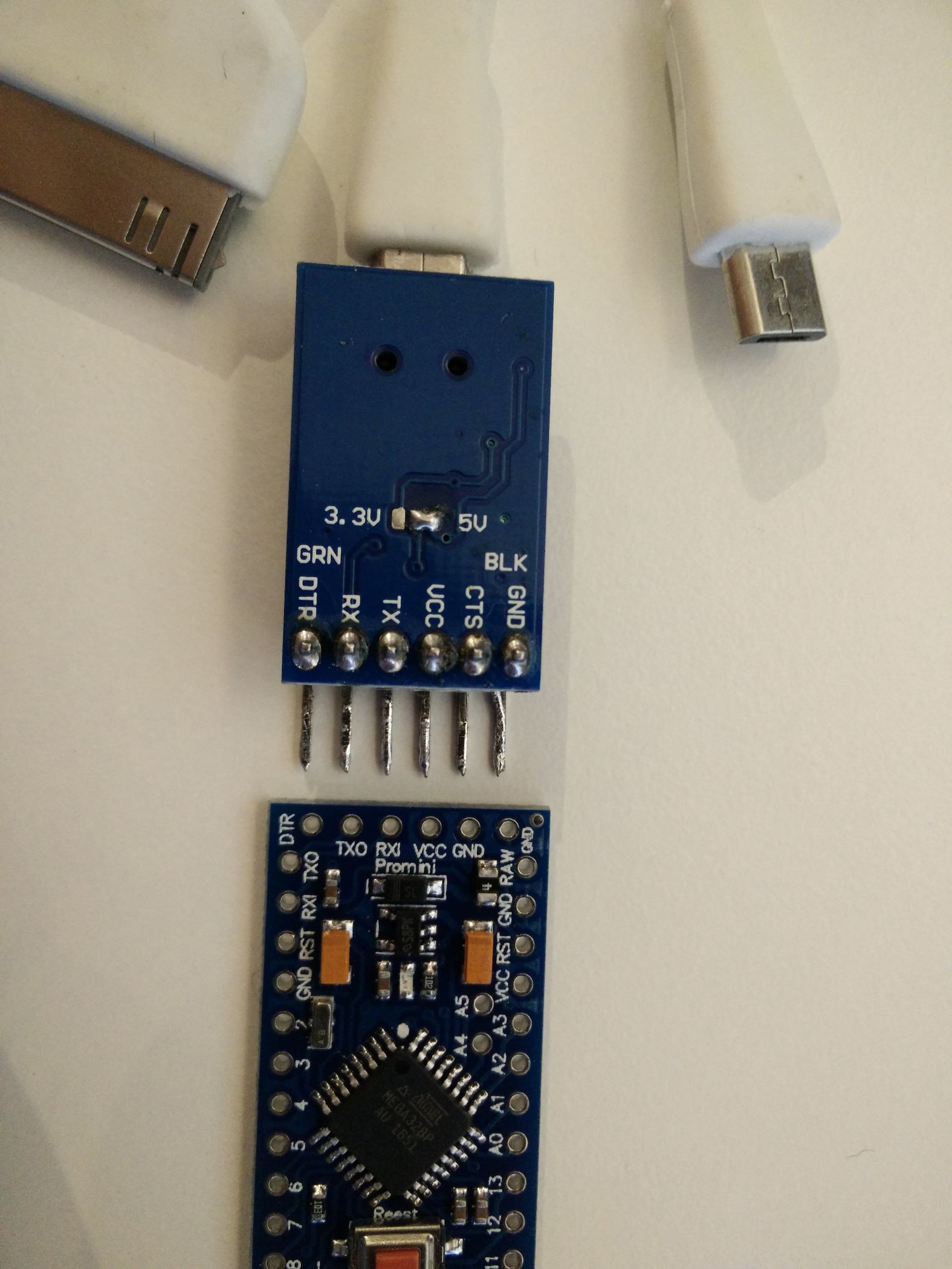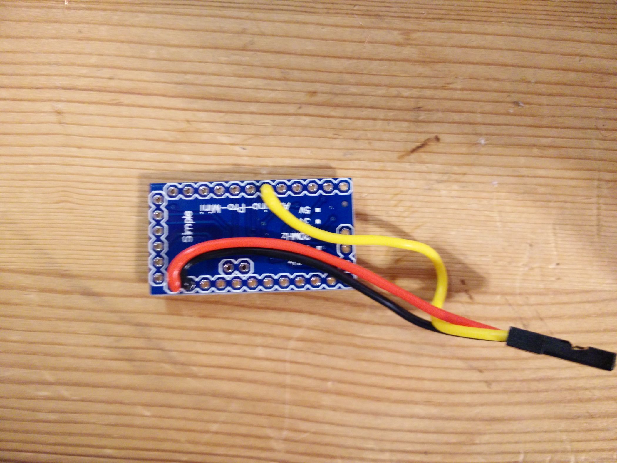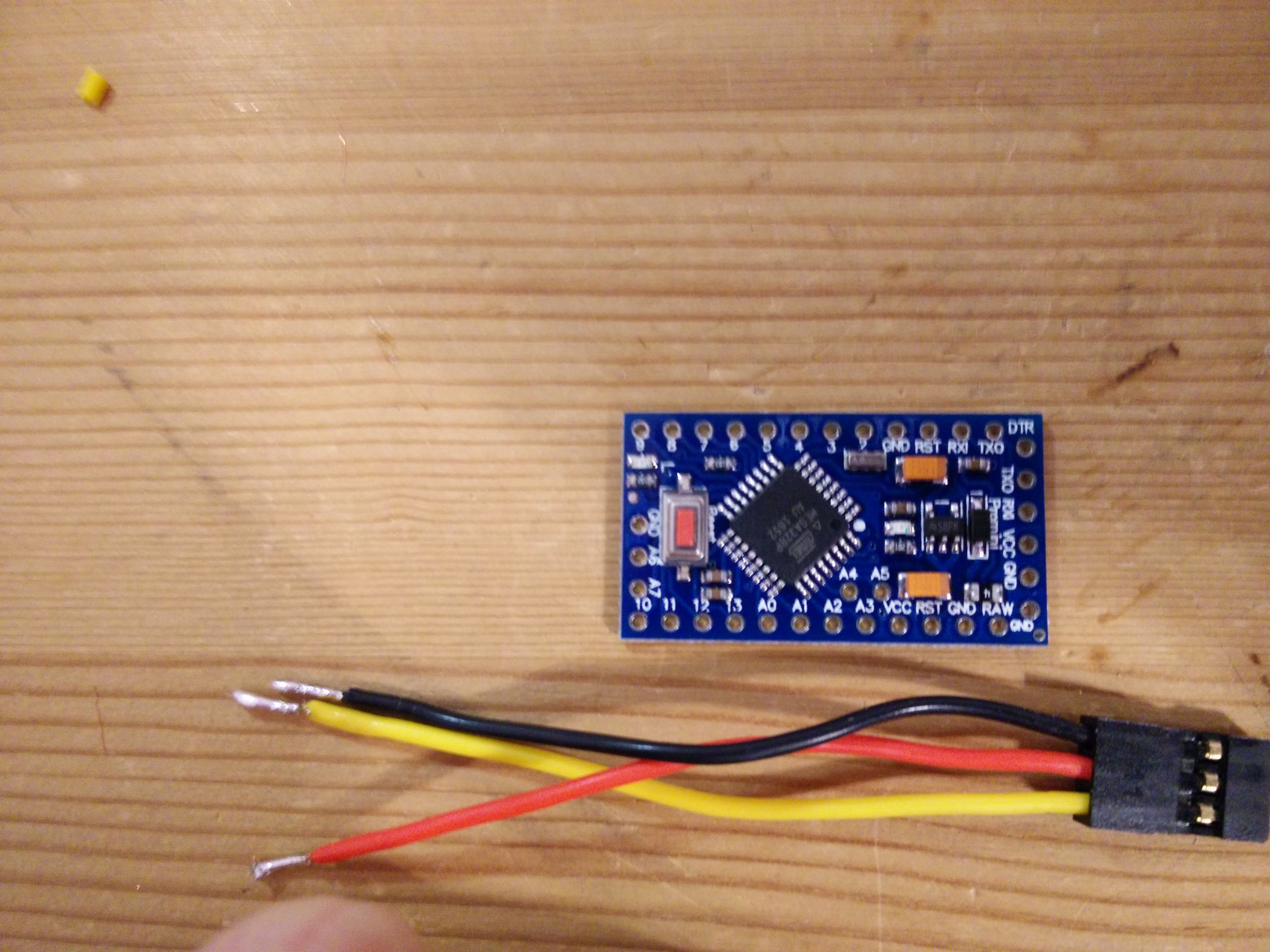 Nämlich so Und es kommt ein schwarzes Drähtchen in GND, ein rotes in VDD: Dann in SCLK und SDA eine 2er Stiftsockelleiste und Festbraten. Jetzt noch das GND-Kabel etwas verlegen … Und so lässt sich das ganze aufstecken. VDD auf dem MS5611-Board kommt in VCC auf dem Arduino-Board. Aber wir löten das noch nicht so fest … erst einmal wird Programmiert. Wir schauen also am FTDI welches Beinchen wo hin gehört — GND zu GND passt (steht ganz am Rand), CTS zu GND, VCC zu VCC, TX zu RX, RX zu TX, und DTR auf DTR … Damit ich nicht löten muss klemme ich das einfach so fest … … und sorge für etwas Vorspannung der Kontakte so dass diese auch wirklich anliegen. Jetzt wird noch schnell ein Servokabel gecrimpt und die enden Verzinnt … Und nach Anleitung aufgesteckt. Von der Oberseite sieht man es besser … … hier: Gelb kommt auf 4, Rot auf RAW, Schwarz auf GND direkt neben RAW. Jetzt dürfen wir also das MS5611-Board wieder aufstecken (Hinweis: Ich habe das Servokabel wieder abgemacht damit man den Rest besser sieht…) Und uns noch einmal versichern: SDA auf A4, SCLK auf A5 — VDD auf VCC, GND … noch nicht… … festbraten — und der GND-Draht steht jetzt dank vorbiegen auch schon passgenau unter dem GND Löchlein am Reset-Taster bereit. Also einmal umbiegen, rein damit, und festlöten. Tjaaa … und das war’s. Jetzt noch der Flash-Vorgang etwas genauer: