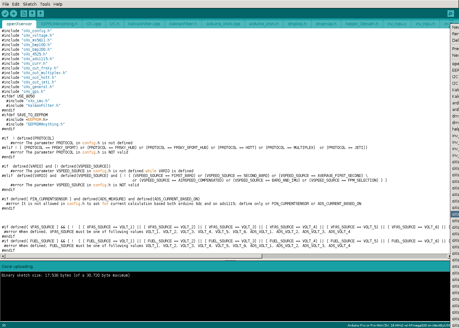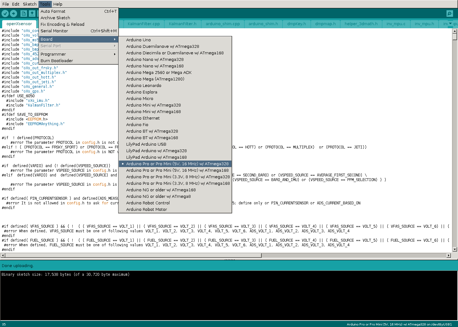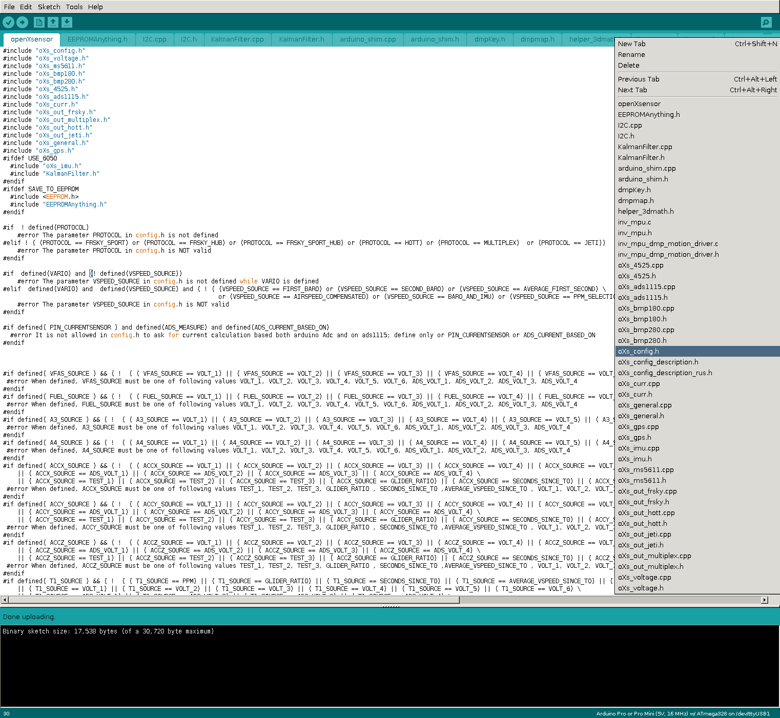 Aalso, so schaut’s im openXSensor-ZIP nach dem entpacken aus. Da gehen wir in’s „openXsensor“-Verzeichnis … … und schnappen uns die „openXsensor.ino“. Die mit der mittlerweile installierten Ardiuno-IDE öffnen: So schaut das dann aus. Dann unter Tools, Board das richtige wählen. Hier wäre das ein Pro Mini mit 5V, 16mHz und ATmega328: Jetzt über die kleine Dateiwahl oben Rechts auf dem Pfeilchen die „oXs_config.h“ auswählen: Und eigentlich nur die Zeile mit
