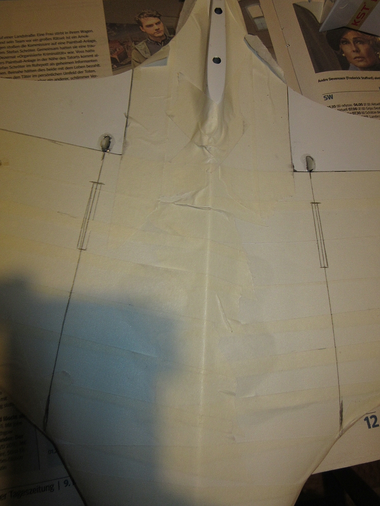 Gegen meine Schusseligkeit wegen Kleberflecken bei dem schönen GFK-Modell habe ich den Flügel mit mässig haftendem Kreppband abgeklebt.