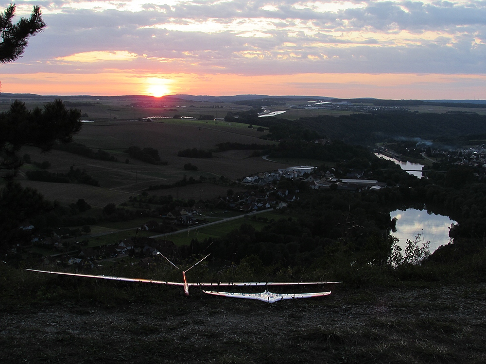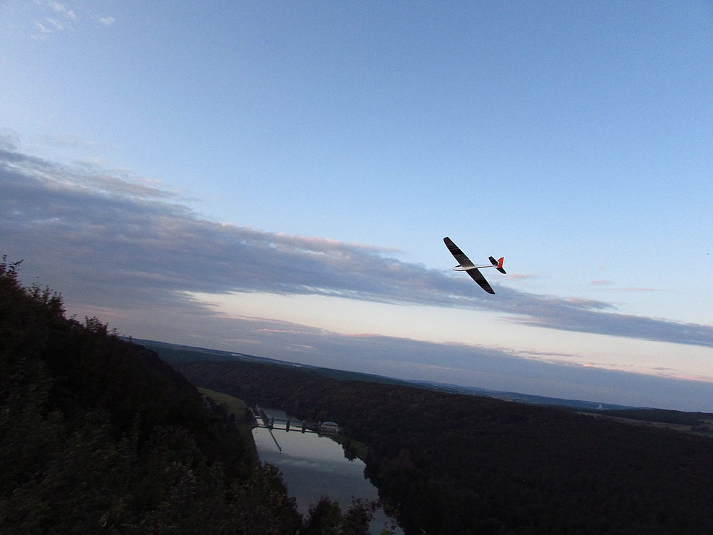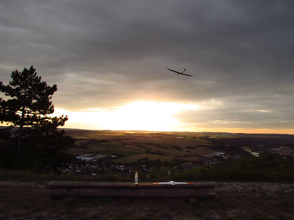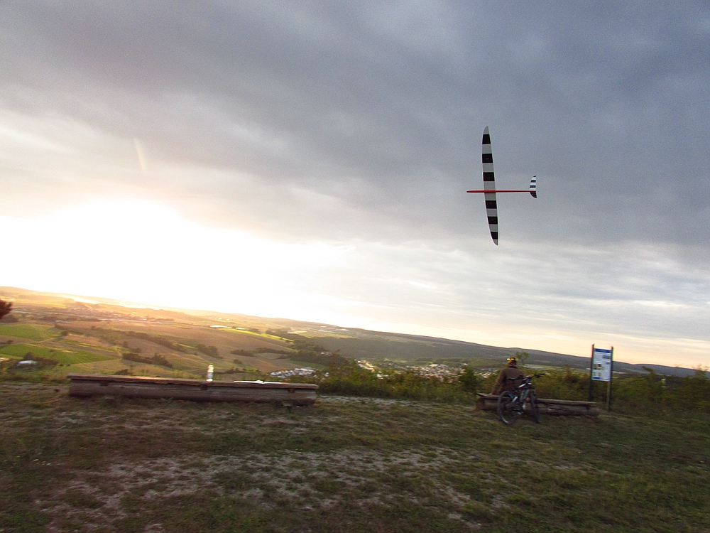 Dienstag Zuhause, am SW-NO ausgerichteten Hang erst den Sackhüpfern beim Absaufen zugesehen. Trotz allem dann doch meine Alpina 4100 über die Kante geschubst und erfolgreich einen schönen Bart bis auf knapp 400m auskurbeln können. Letzlich waren es dann 1.5 Stunden am Stück. Nach einer Pause dann noch 45 Minuten entspanntes Sonnenuntergangsfliegenfliegen