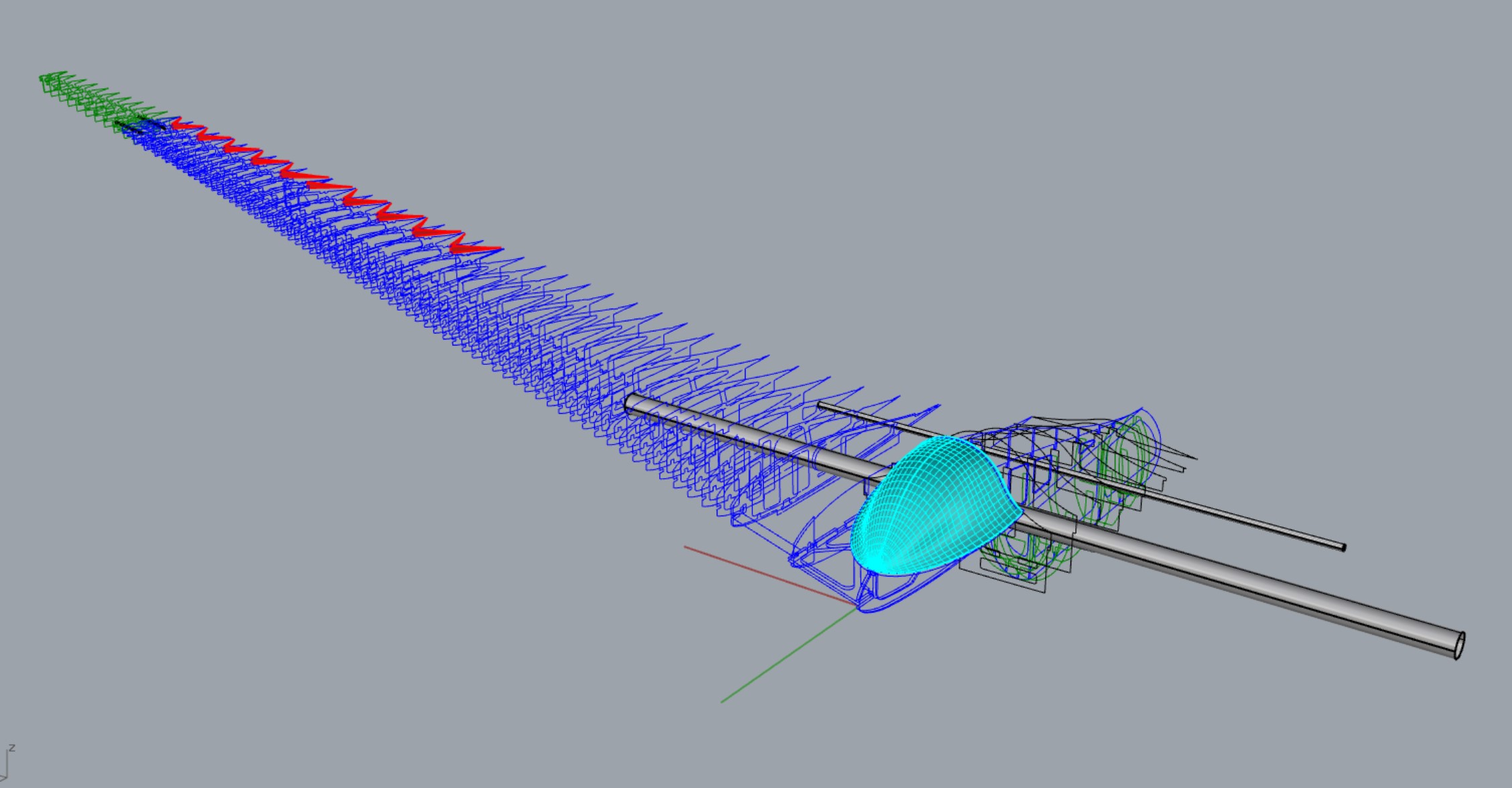 Die Anbindung und Versteifung durch Stützstreben/Holmgurte im Mittelteil wird noch kommen, da muss ich noch ein wenig dran feilen, das ist aber im CAD nicht mehr so ein großes Problem,