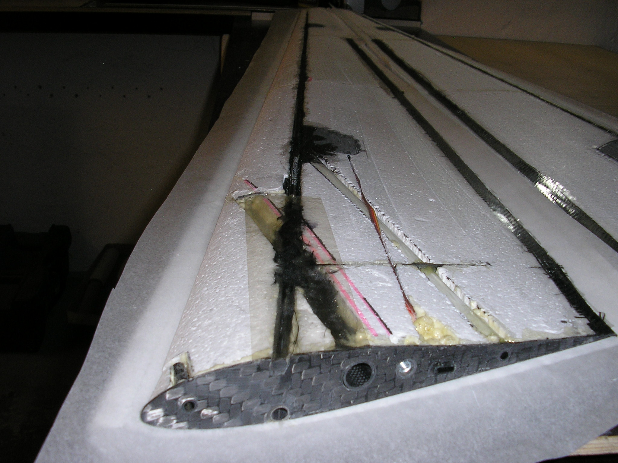 Die Tragflächen sind Rohbauseitig mit einer diagonal gelegten CFK D-Box verstärkt worden, was eine ordentliche Torsionsfestigkeit mit sich bringt.