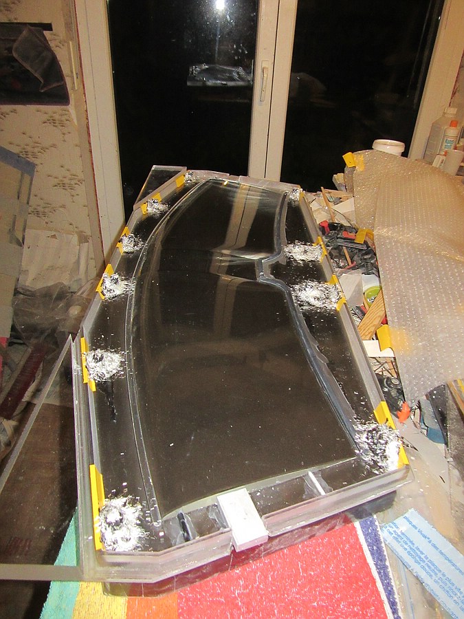 Das verkleben mit der Heißklebepistole und spätere wieder lösen hat sehr gut geklappt, die Urmodelle sind damit absolut gerade solange die Fensterbank auf einer halbwegs ebenen Unterlage liegt oder aufrecht steht. Das Urmodell mit der Form und der Fensterbank sind zusammen allerdings relativ schwer und deshalb alleine umständlich zu handhaben. Das ist jetzt bei der 30 x 150 cm Fensterbank für die Außenflächen noch mal schwieriger als bei der 25 x 125 cm des Mittelflügels.jonasm hat geschrieben:wie hat das Verkleben der krummen Urmodelle auf einer geraden Fensterbank denn jetzt eigentlich geklappt?