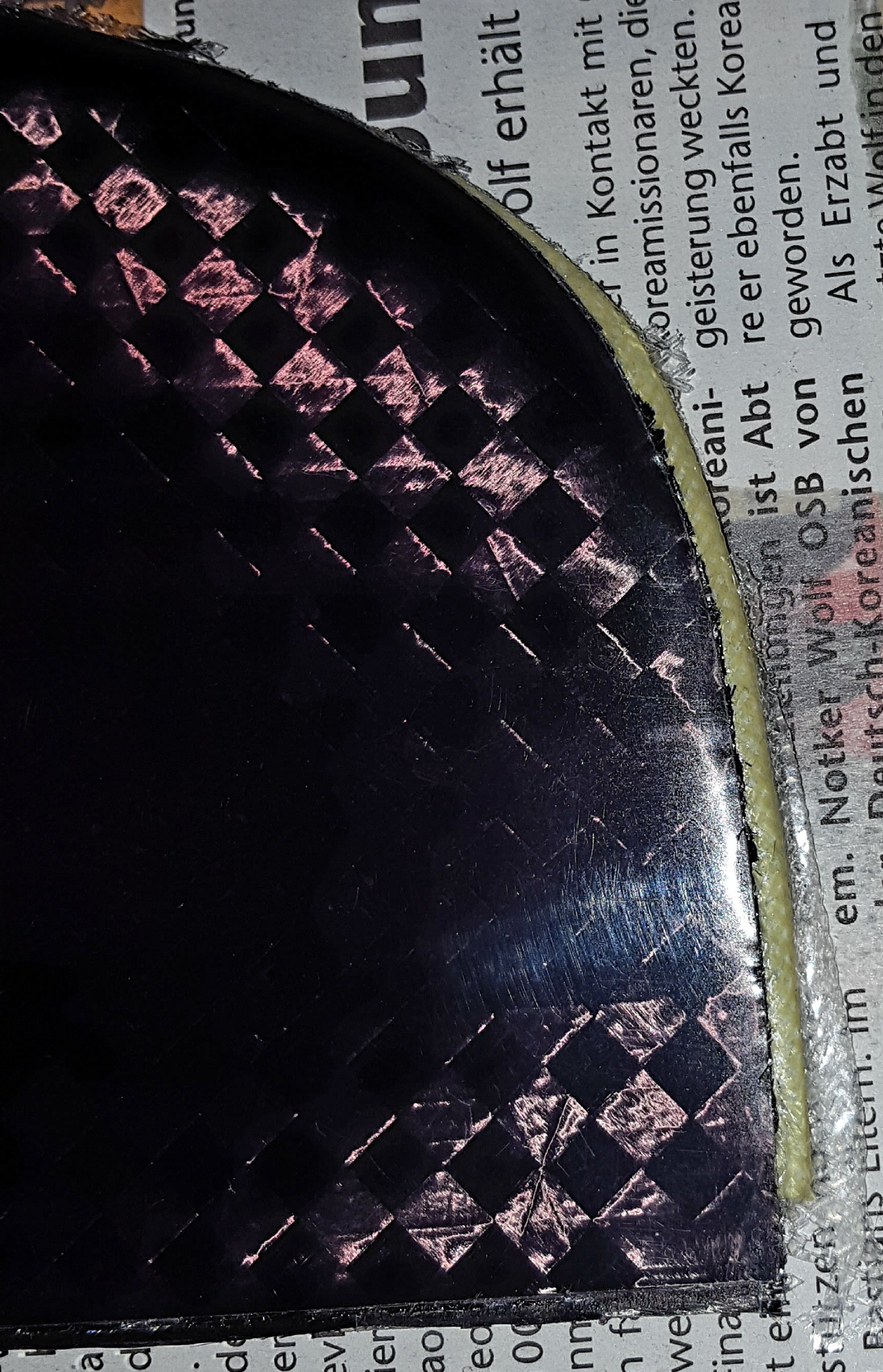 Danach Ritze ich mit einer Trennscheibe an einem Stahllineal entlang das Gewebe der Unterschale bis auf das Kevlargewebe durch.