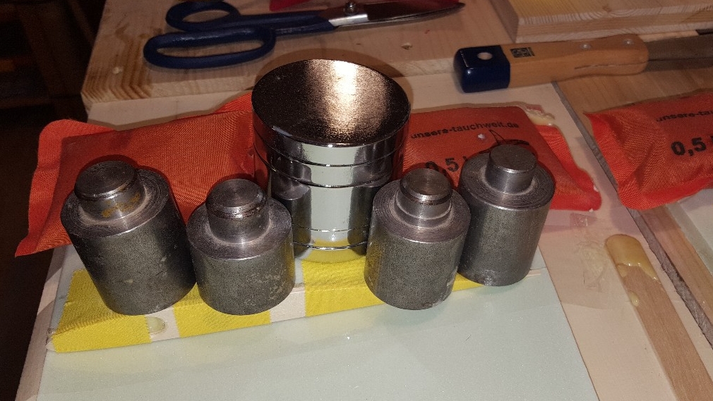 Um keinen Verzug einzubauen wird das Ganze zum Aushärten wieder in die Negativschalen gelegt und mit Gewichten beschwert.