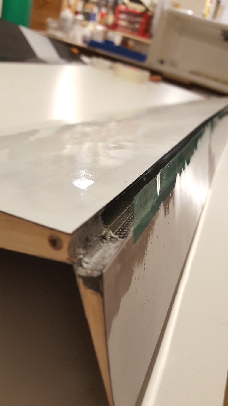Jetzt wird alles getränkt, auf den Mylars positioniert und mit Zewa das überschüssige Harz abgedrückt. Danach wird das überstehende Gewebe sauber beschnitten. Als nächstes wird der Verbund an der Nasenleiste mit Harz getränkt und anschließend die Mylar Folien positioniert und mit Tape fixiert.