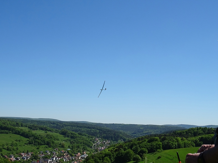 Zunächst kam die personentragende DG 1000 "Schloß Johannisburg" übern Pfaffenberg und dann kam tatsächlich eine Phase von etwa 20 Minuten mit schwachen Abendthermik-Ablösungen, die aber für meinen Shooter reichte um das Spessartsegler-Pflichtprogramm und ein bisschen mehr zu fliegen
