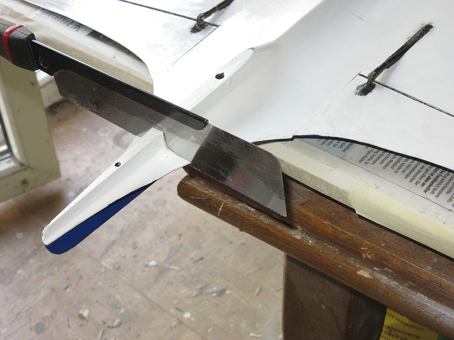 Zum Glück hat Mario hinten am Seitenleitwerk einen 3. Fixierstift konstruiert, damit lässt sich das abgesägte Stück Bürzel mit Tesa paßgenau an der Finne befestigen. Am abgesägten Teil passte unten auch noch ein waagerechter 3 mm Kohlestift zusätzlich genau rein, so dass auch unten eine Seitenführung dran ist um die Tesabefestigung zu entlasten.