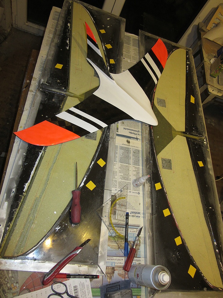 Die Anformungen für das Leitwerk und die Versteifung unter der Fläche sind sehr schwierig zu laminieren und auch vorher schwierig zu lackieren.