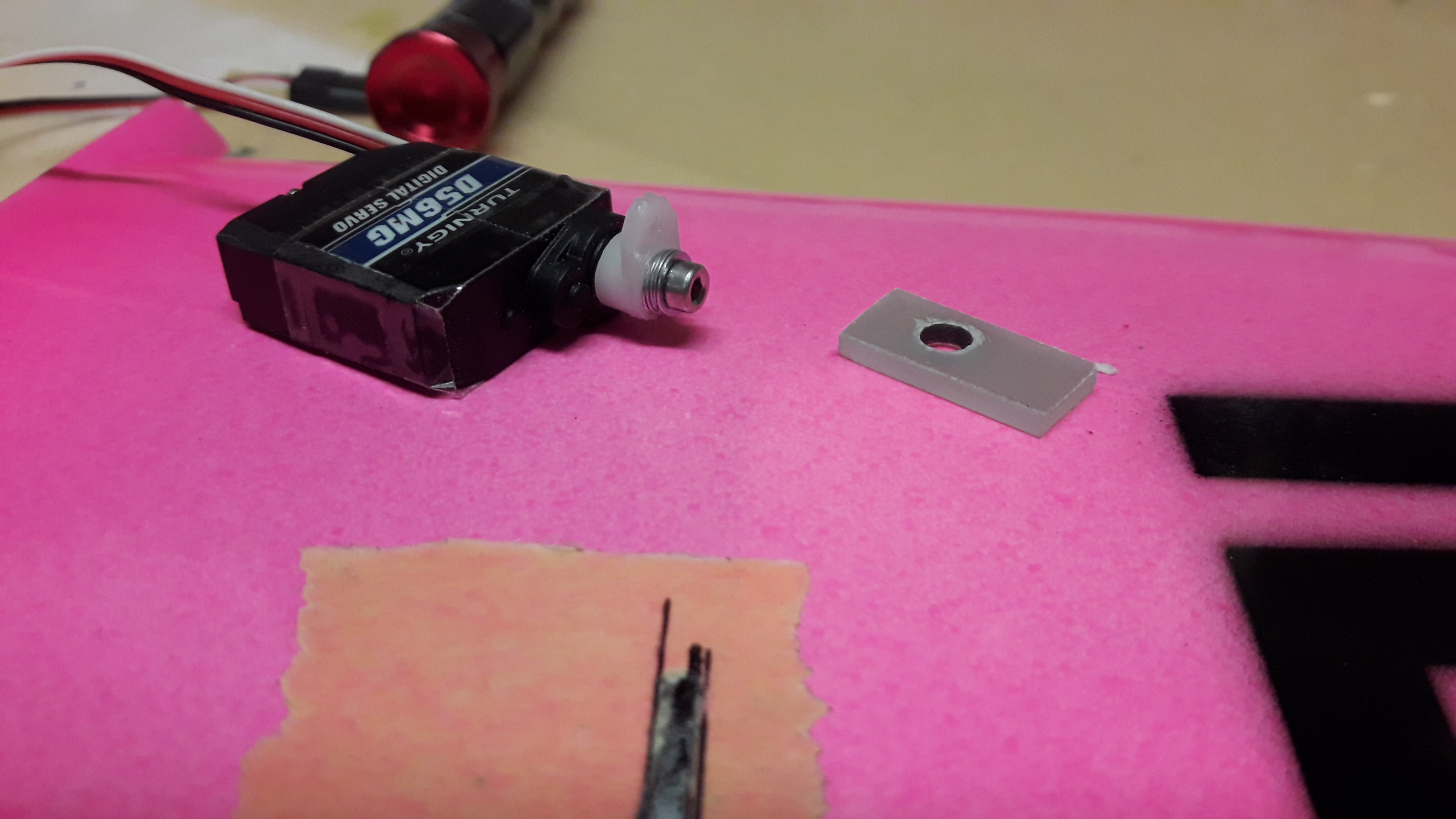 Da ich in dem Pinken billige servos verwende (Ds56Mg) habe ich nun mal Low-Budget-Gegenlager gebaut.... minimiert das spiel selbst bei den 7€ servos auf ein minimum.... besser als ich es von den X08 ohne gegenlager in erinnerung habe