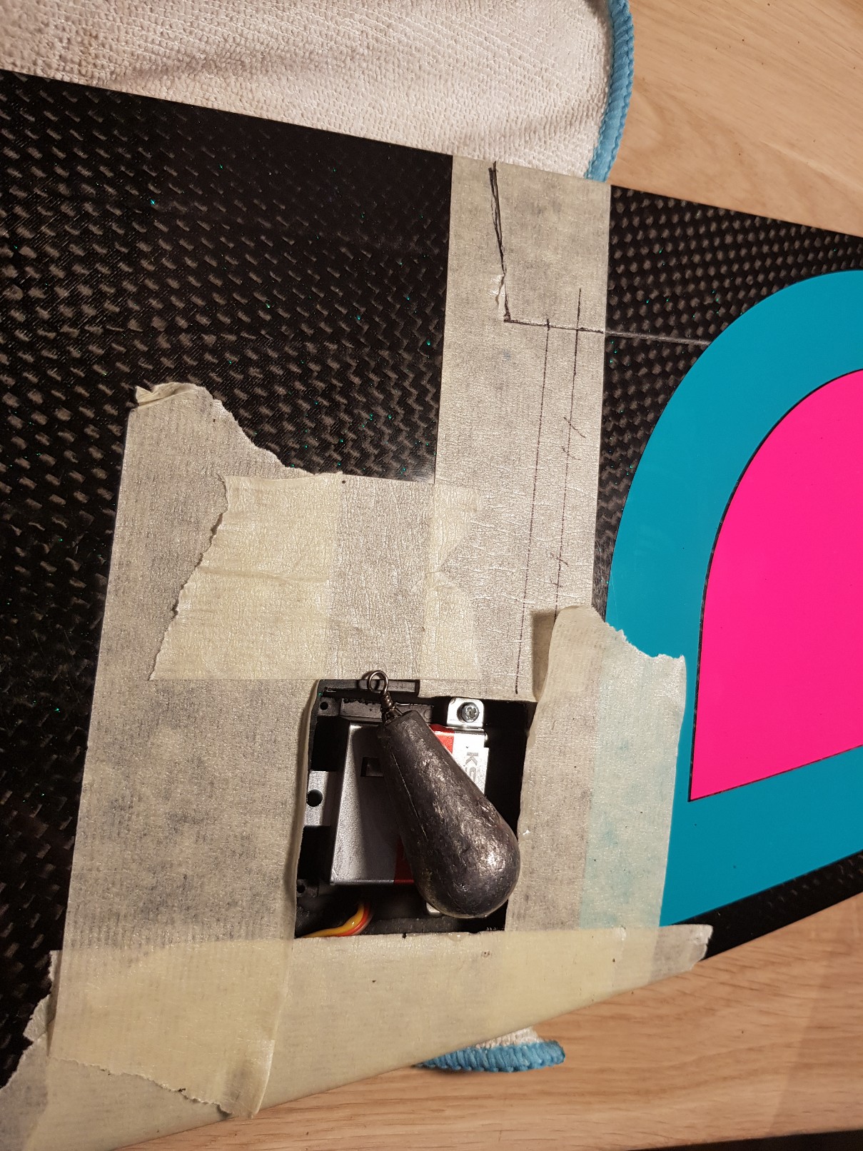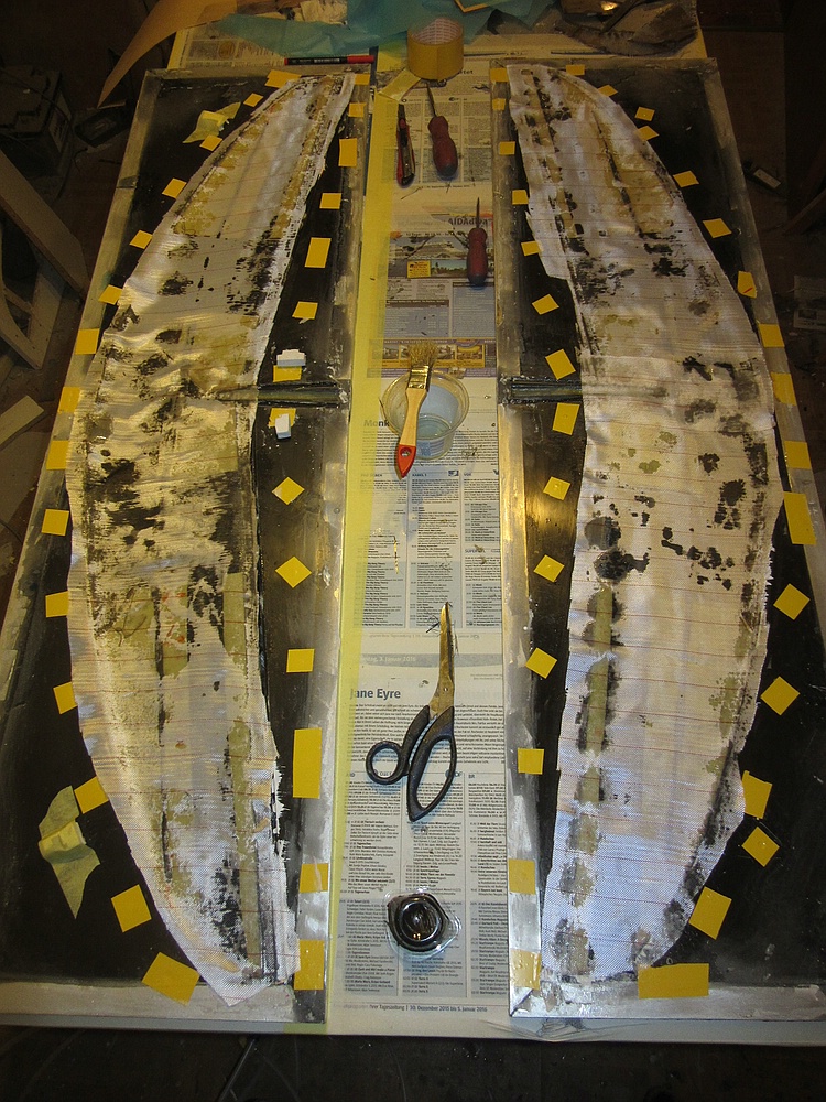 Innenlage soll 50er Glas und ein paar schmale Reststreifen ST-Kohle am Ruderscharnier und auf der Gestängeachse werden, die wird separat mit den Holmgurten eingesaugt.