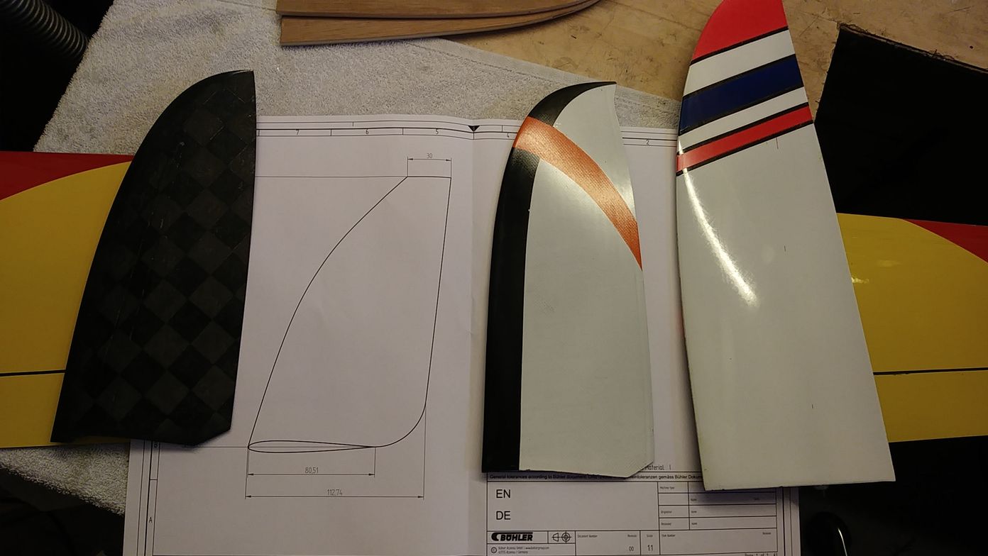 mir wären die Diva-Leitwerke ohne die ausgesparte Seitenruder-Ecke am liebsten, also die ganzen 110 mm Winglettiefe als Anschluß-Flächentiefe des Flügels, dafür die Höhe der Diva-Leitwerke um das hintere Dreieck gekürzt.