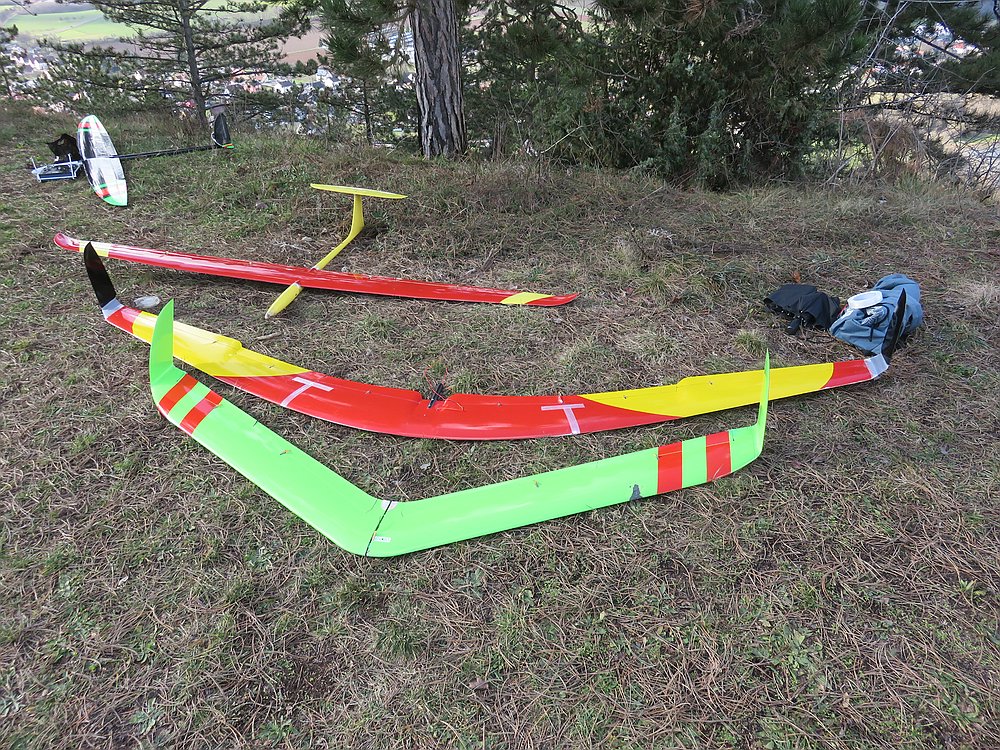Jörg hatte den einen Verbinder für den Wingletanschluss versehentlich im Auto gelassen und kurzerhand durch ein Ästchen ersetzt, aber der sehr regional erzeugte Bio-Verbinder hat im DS nicht lange gehalten, das rechte Winglet wollte dann doch lieber alleine fliegen :roll: