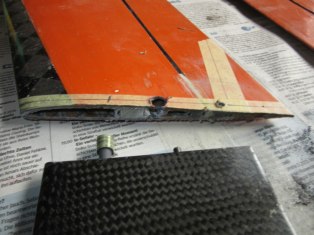 Ganz außen ist eine Lage 80er ST-Kohle vollflächig, außer in der Flügelmitte hinter dem Holm, dort ist ein 2,4 GHz-freundliches Fenster aus Basalt für den Empfängereinbau.