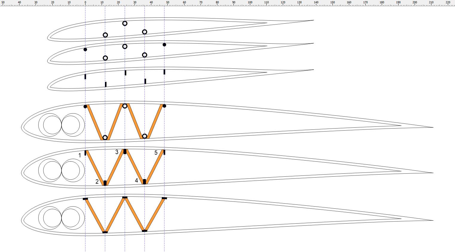 Eventuell würde ich auch die mittleren drei gegen 3mm Rohre tauschen die dann bis zur Endrippe raus gehen