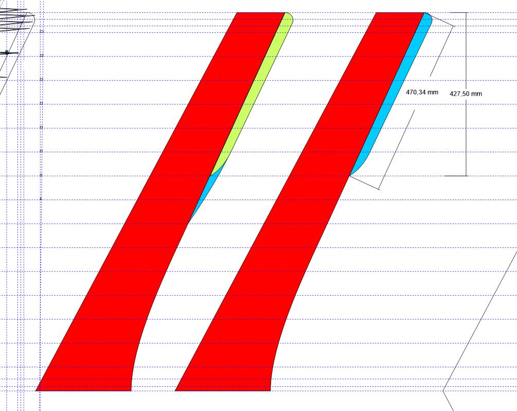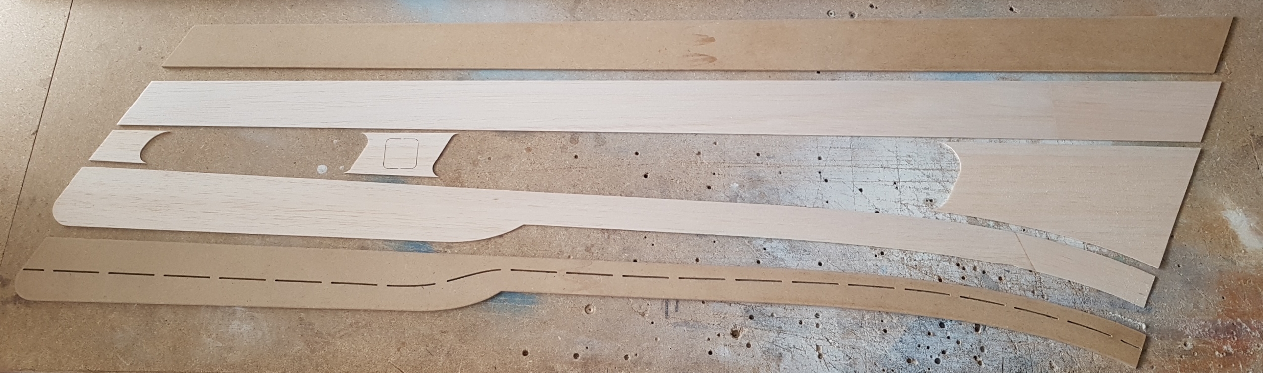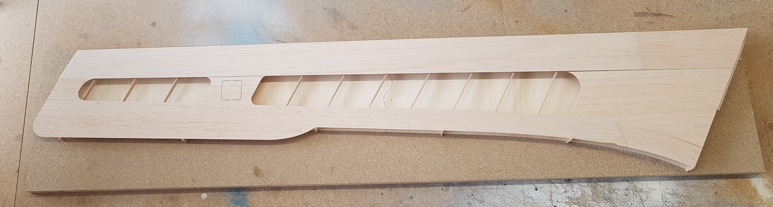Die ist allgemein sehr dünn und nicht sonderlich tief dafür aber etwas über 60cm lang das einigermaßen torsionssteif hin zu bekommen wird interessant. Ich werde für die Beplankungsteile Schablonen aus 3mm HDF fräsen die für die Endleiste / Klappe lasse ich hinten raus 5mm länger.