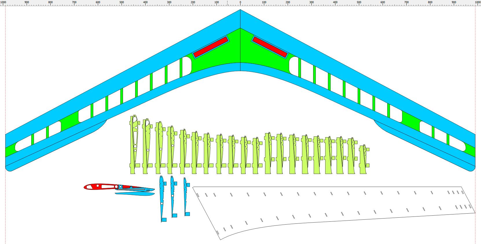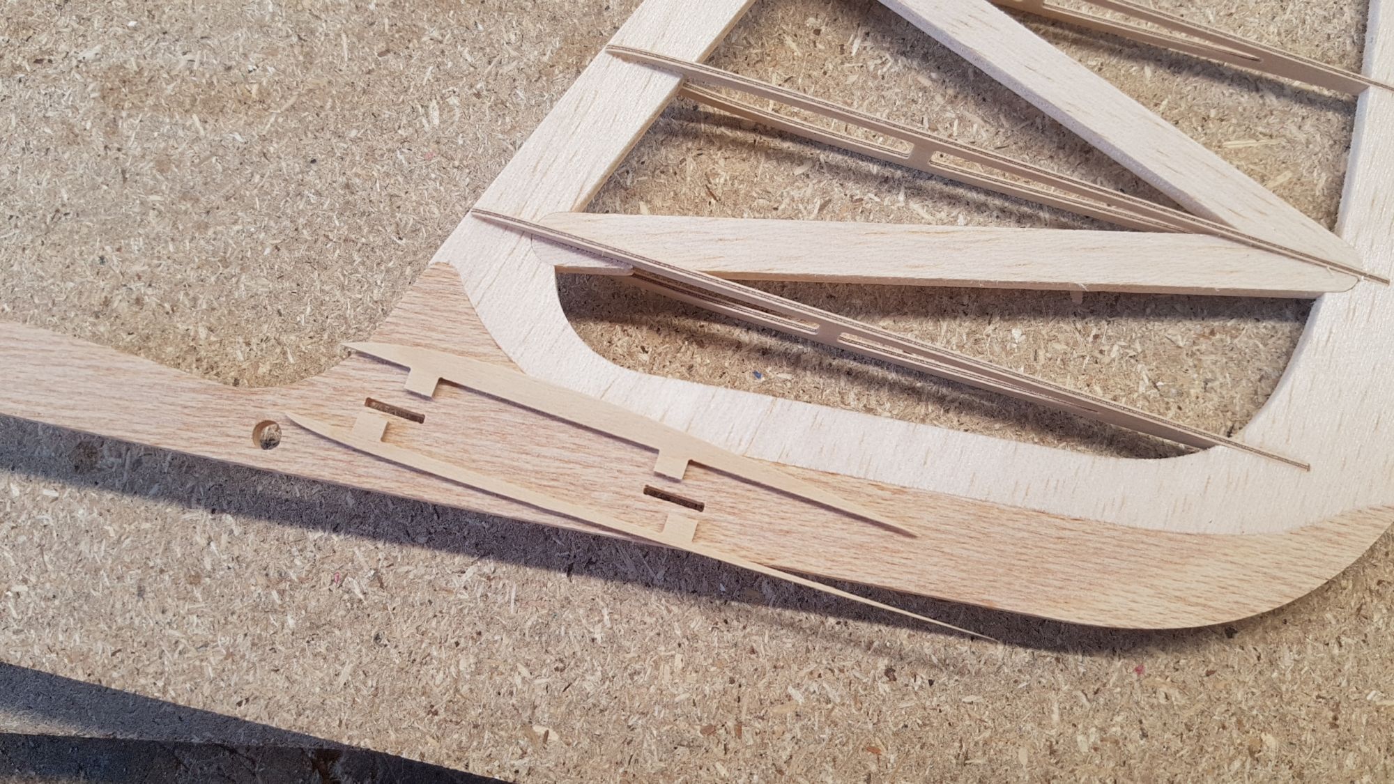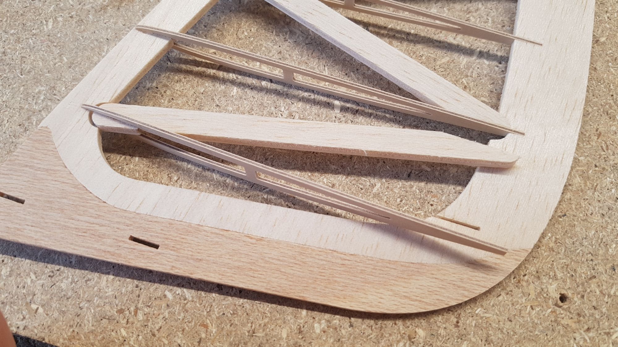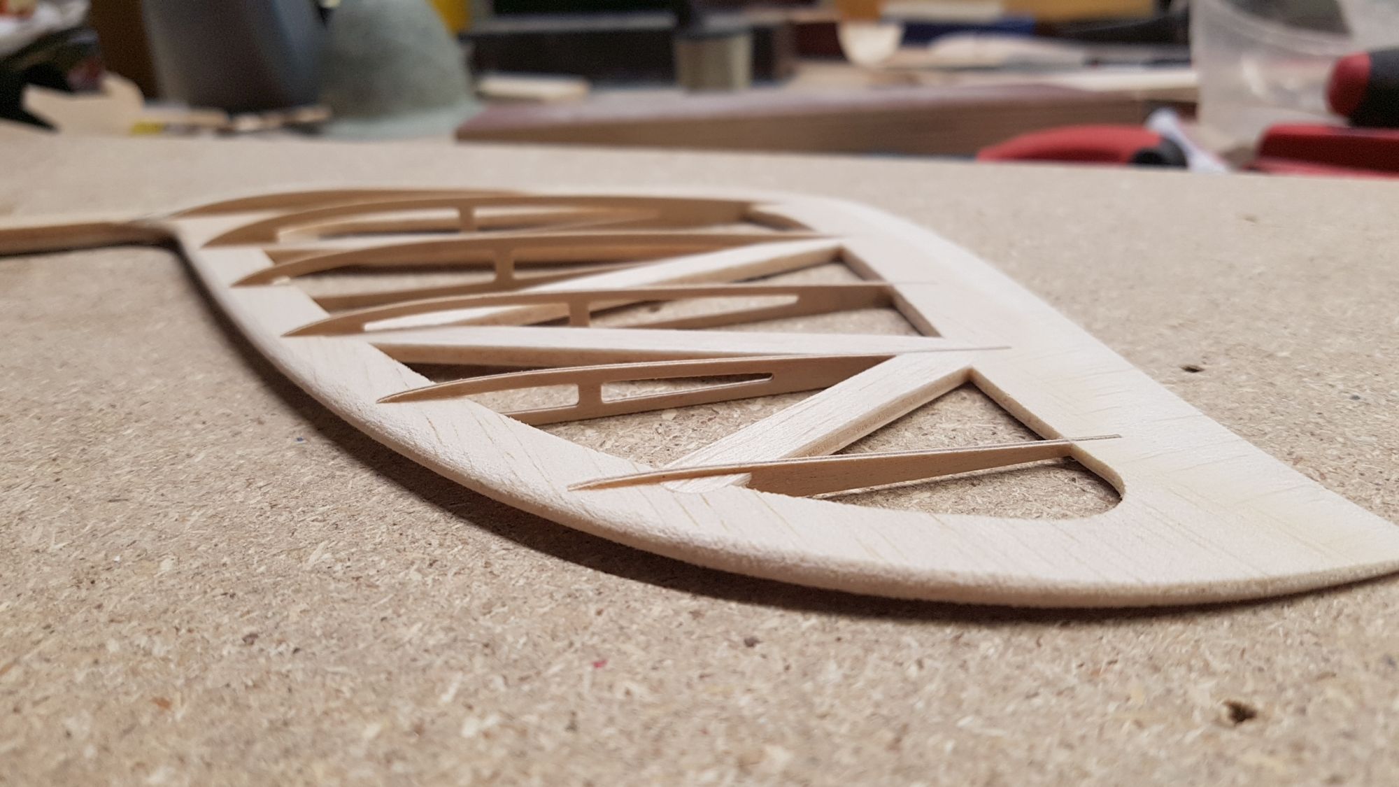 Wenn Du 1,5 mm Beplankung verwendest solltest Du auch für die Endleiste ein paar Schleifschablonen mit fräsen, der Überstand hinter den Rippen ist schon arg lang.