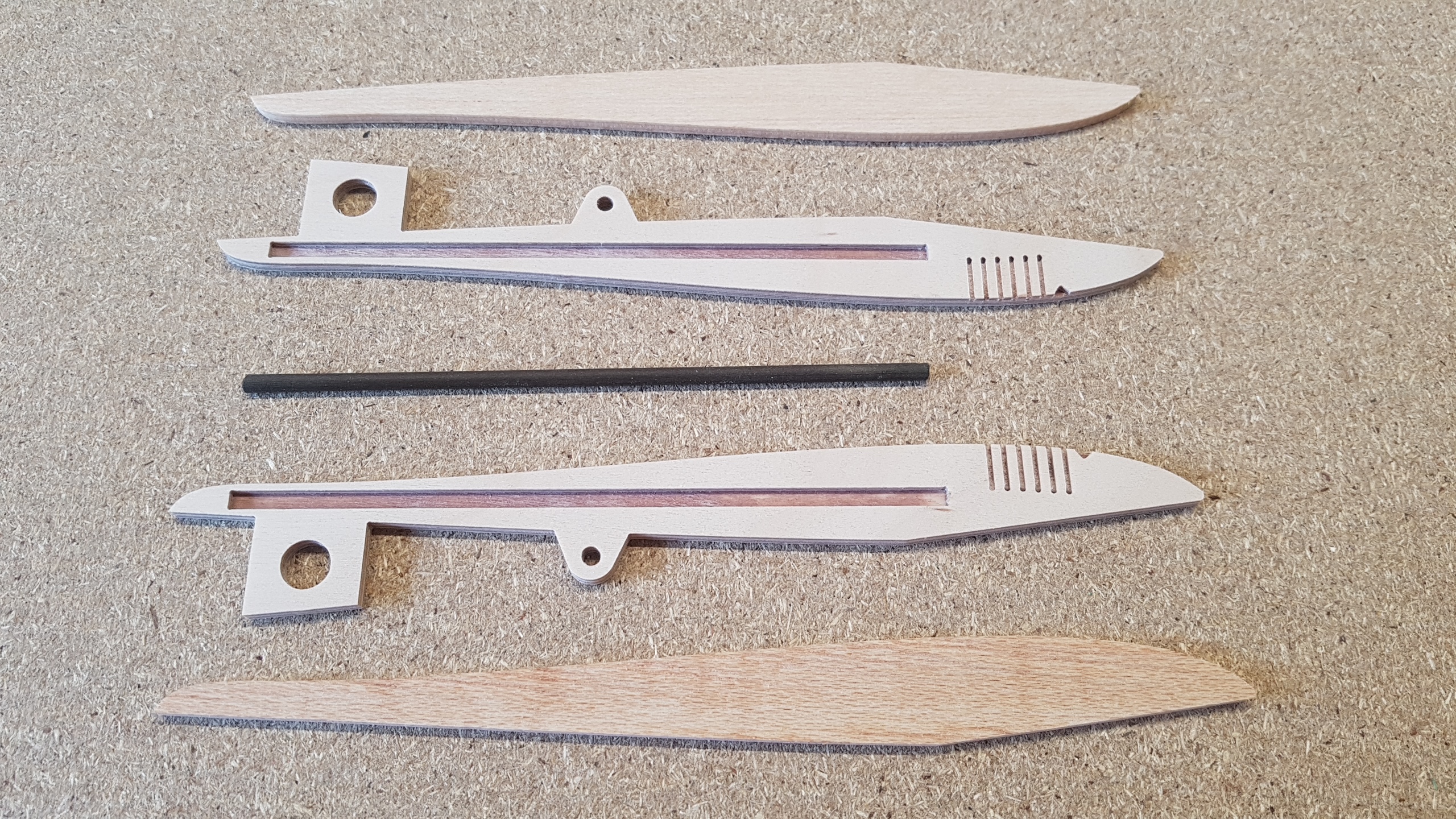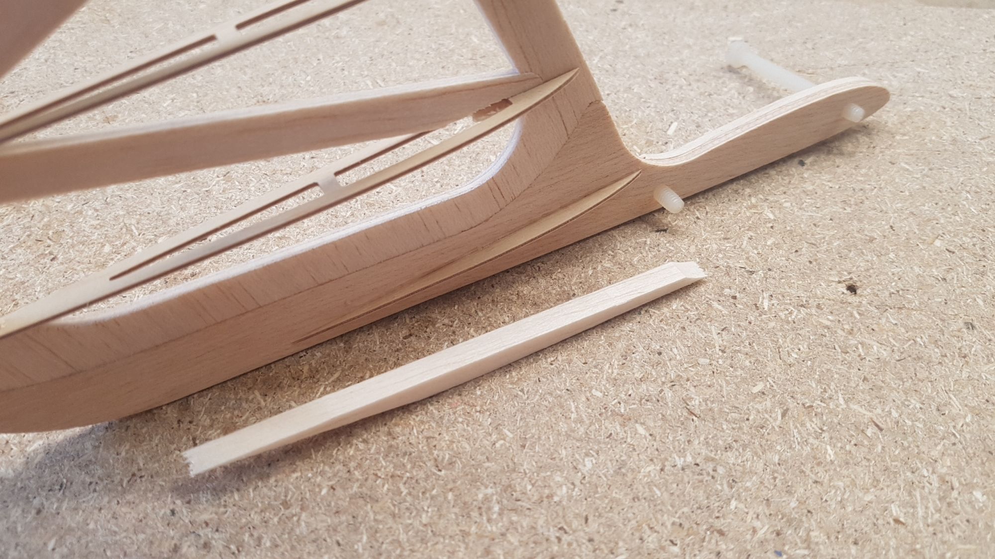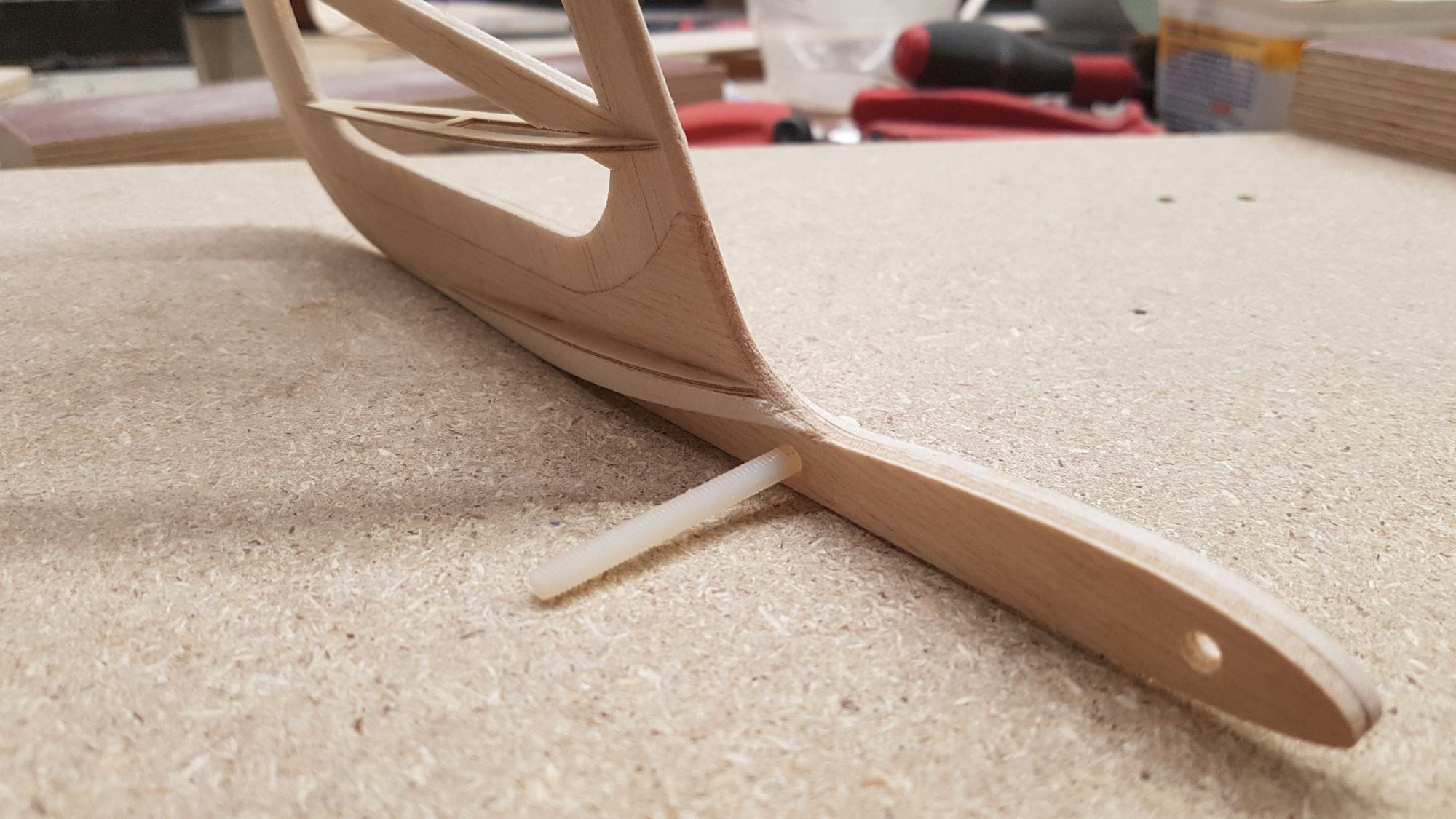 Rumpf im Kern aus 2 x 3mm Birkensperrholz mit einem Stück 3mm cfk Rohr. Seitlich 3mm Caiba für etwas mehr zum anfassen und die Auflage unterm Flügel zu vergrößern.